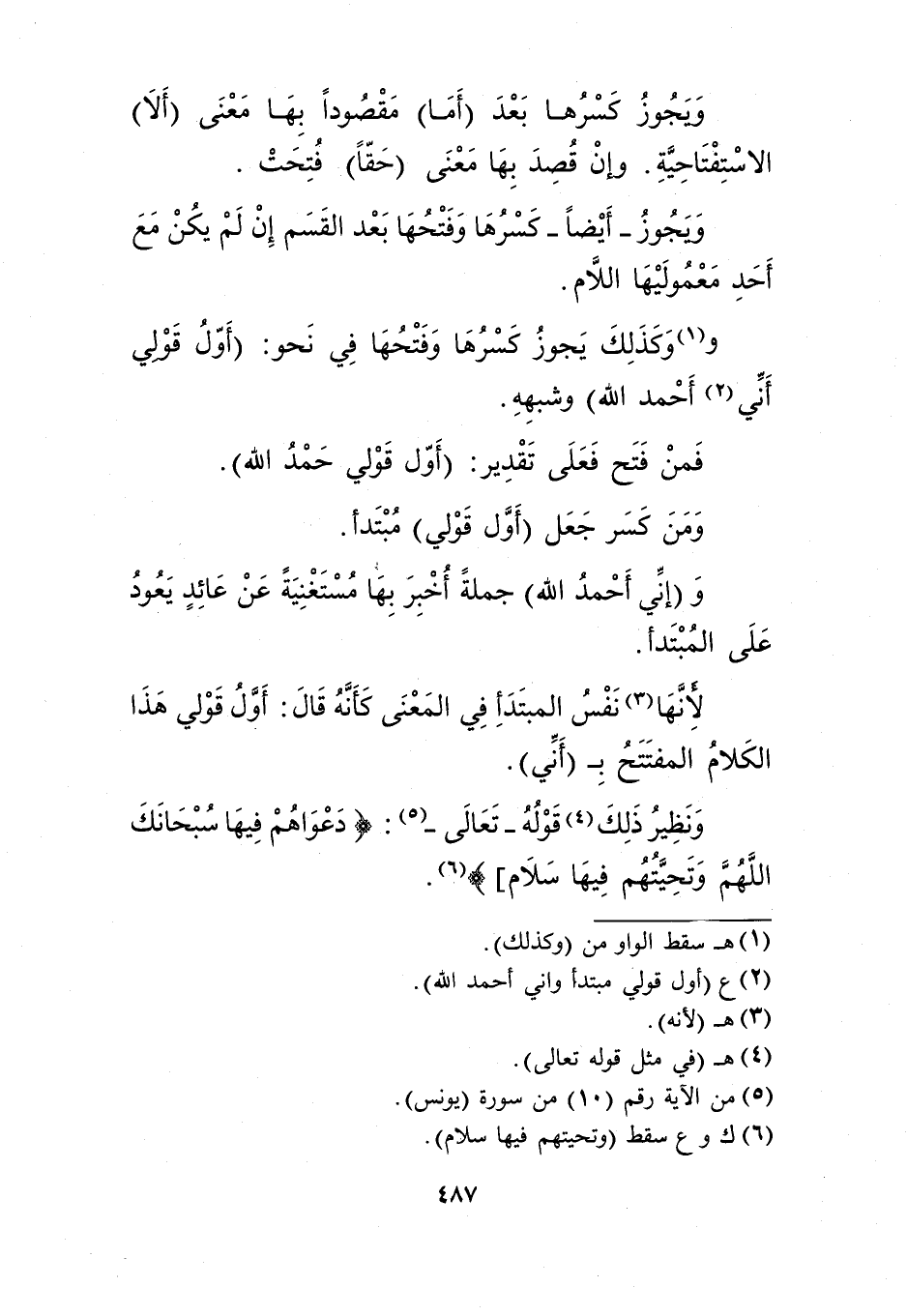 و1 وكذلك يجوز كسرها وفتحها في نحو: "أول قولي أني2 أحمد الله" وشبهه.