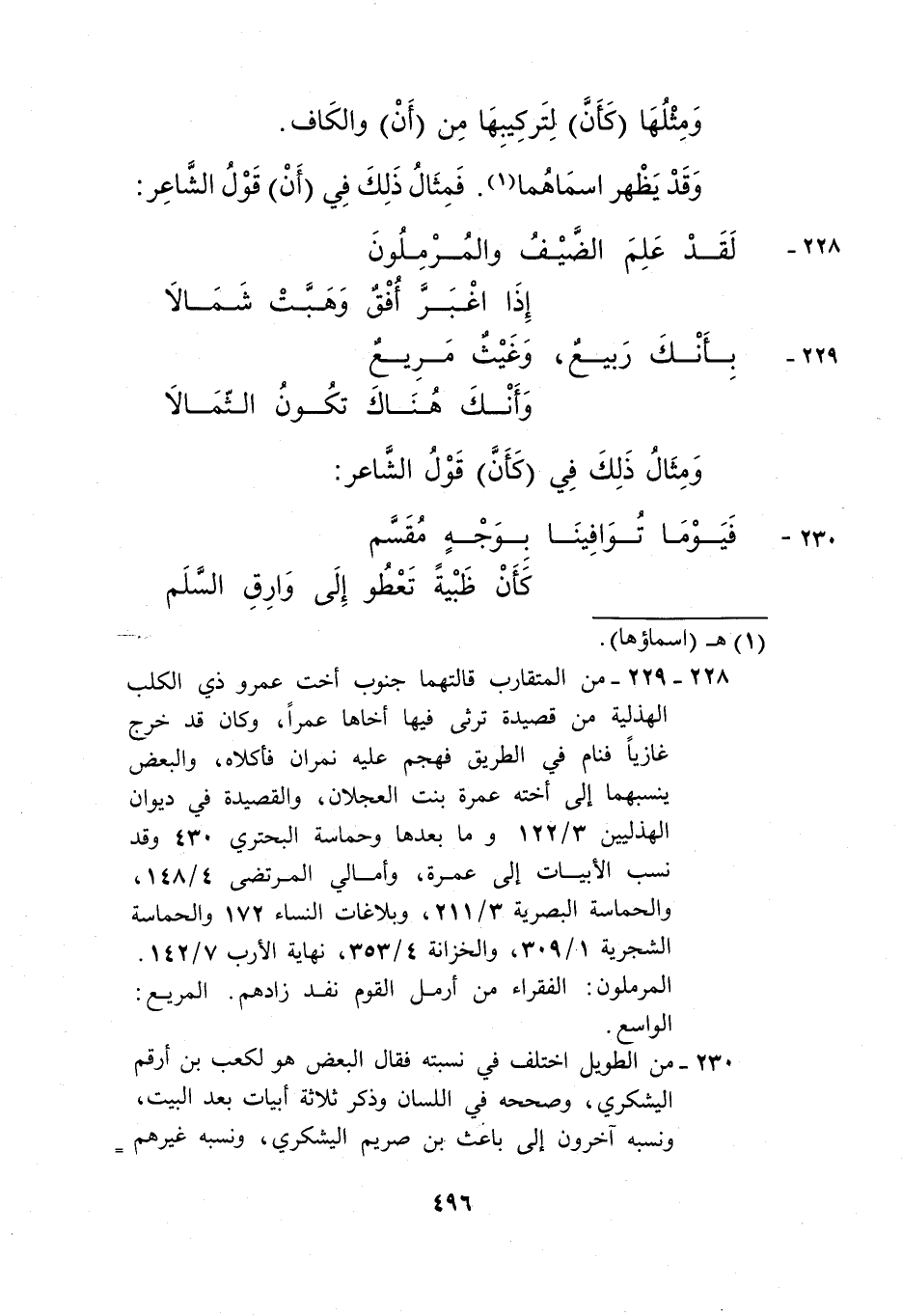 228- 229- من المتقارب قالتهما جنوب أخت عمرو ذي الكلب الهذلية من قصيدة ترثي فيها أخاها عمرًا، وكان قد خرج غازيًا فنام في الطريق فهجم عليه نمران فأكلاه، والبعض ينسبهما إلى أخته عمرة بنت العجلان، والقصيدة في ديوان الهذليين 3/ 122 وما بعدها وحماسة البحتري 430 وقد نسب الأبيات إلى عمرة، وأمالي المرتضى 4/ 148، والحماسة البصرية 3/ 211، وبلاغات النساء 172 والحماسة الشجرية 1/ 309، والخزانة 4/ 353، نهاية الأرب 7/ 142.