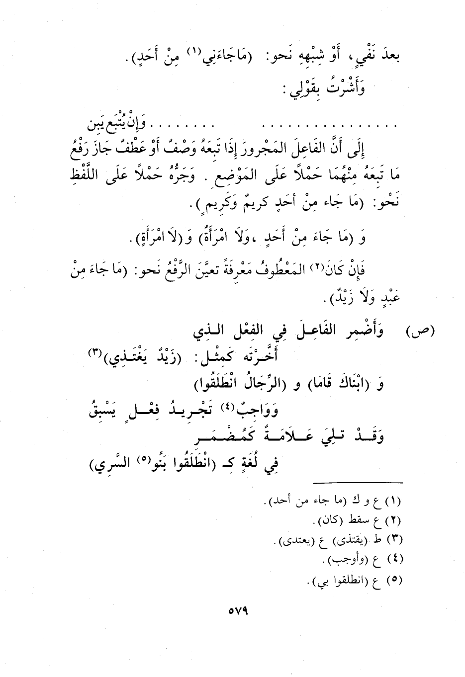 إلى أن الفاعل المجرور إذا تبعه وصف أو عطف جاز رفع ما تبعه منهما حملا على الموضع. وجره حملا على اللفظ نحو: "ما جاء من أحد كريم وكريم".