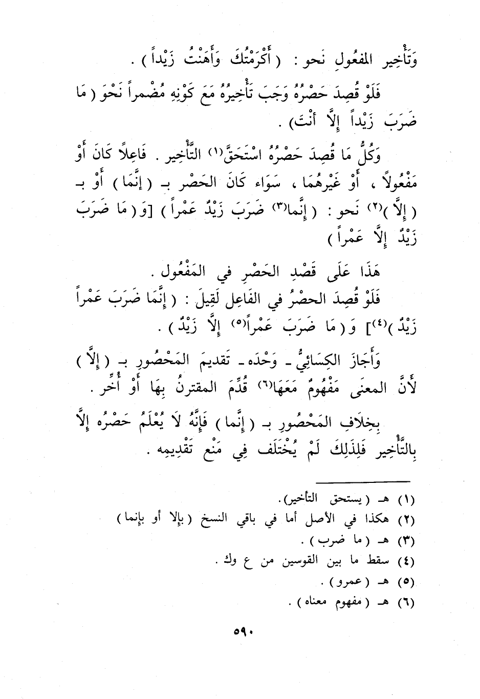 وكل ما قصد حصره استحق1 التأخير. فاعلا كان أو مفعولا، أو غيرهما، سواء كان الحصر بـ"إنما" أو بـ"إلا"2 نحو: "إنما3 ضرب زيد عمرا" [و"ما ضرب زيدا إلا عمر".