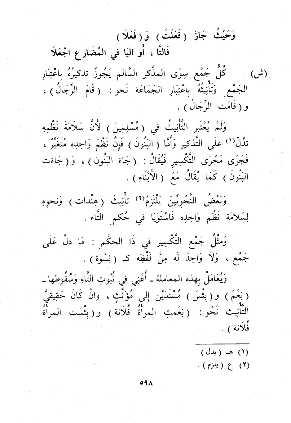 "ش": كل جمع سوى المذكر السالم يجوز تذكيره باعتبار الجمع وتأنيثه باعتبار الجماعة نحو: "قام الرجال"، و"قامت الرجال".