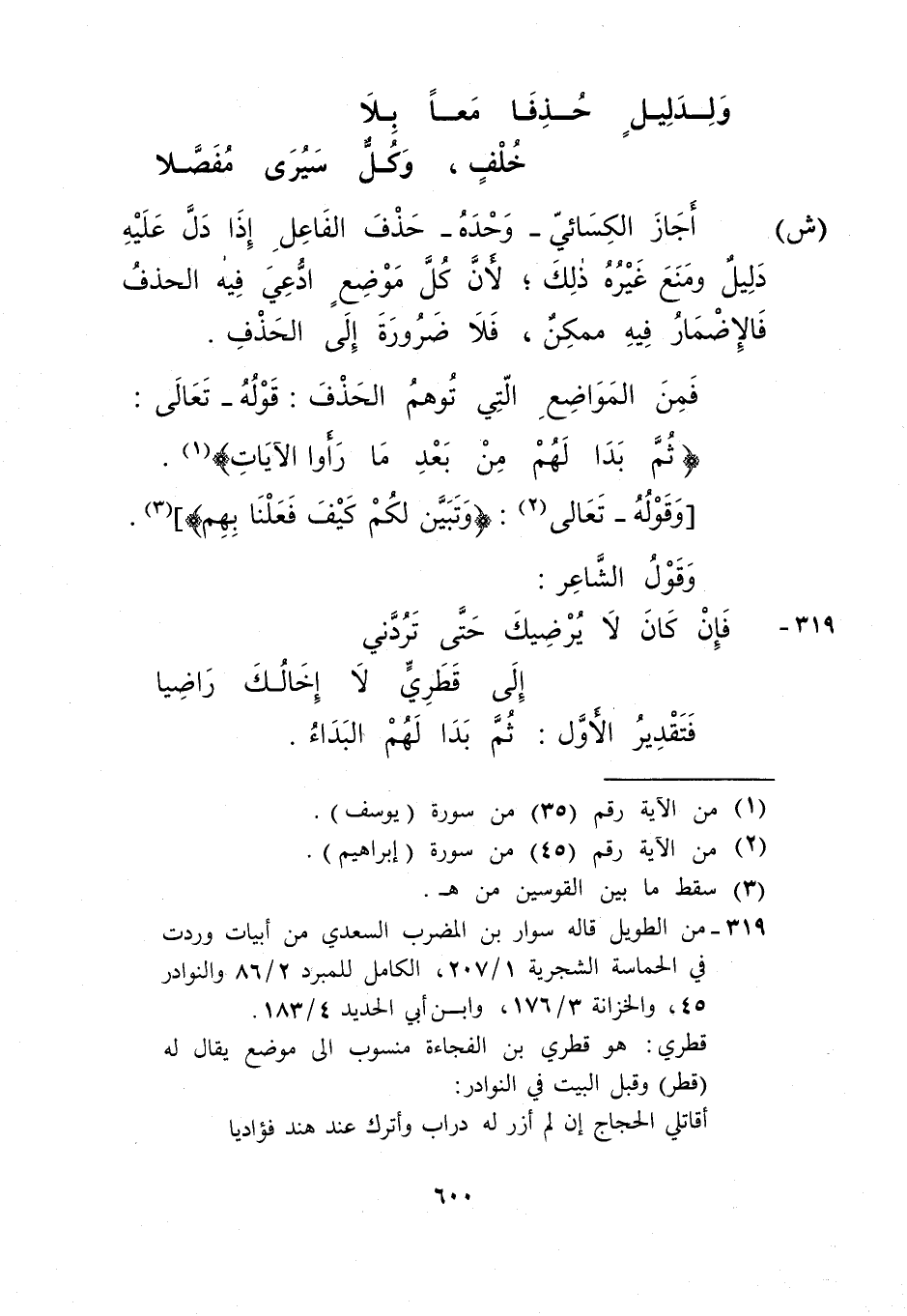 "ش": أجاز الكسائي -وحده- حذف الفاعل إذا دل عليه دليل ومنع غيره ذلك، لأن كل موضع ادعي فيه الحذف فالإضمار فيه ممكن، فلا ضرورة إلى الحذف.