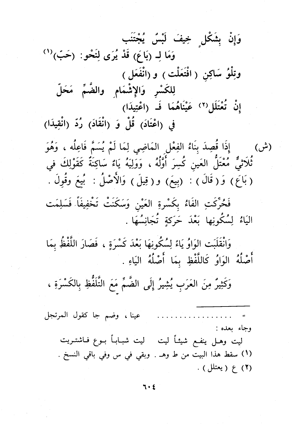 "ش": إذا قصد بناء الفعل الماضي لما لم يسم فاعله، وهو ثلاثي معتل العين كسر أوله، ووليه ياء ساكنة كقولك في "باع" و"قال": "بيع" و"قيل" والأصل: بيع وقول.