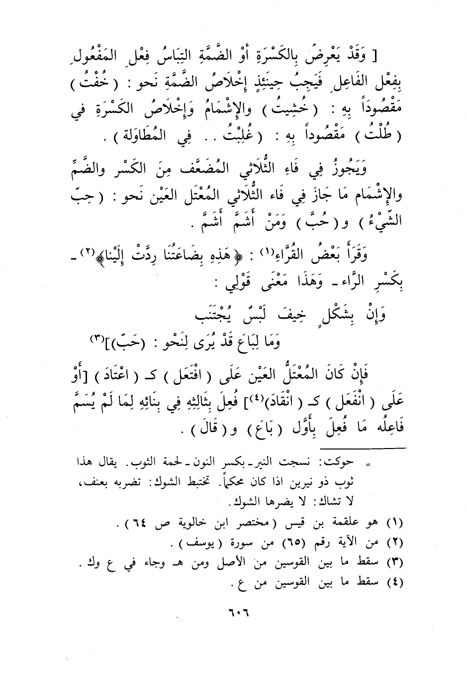 [وقد يعرض بالكسرة أو الضمة التباس فعل المفعول بفعل الفاعل فيجب حينئذ إخلاص الضمة نحو: "خفت" مقصودا به: "خشيت" والإشمام وإخلاص الكسرة في "طلت" مقصودا به: "غلبت ... في المطاولة".