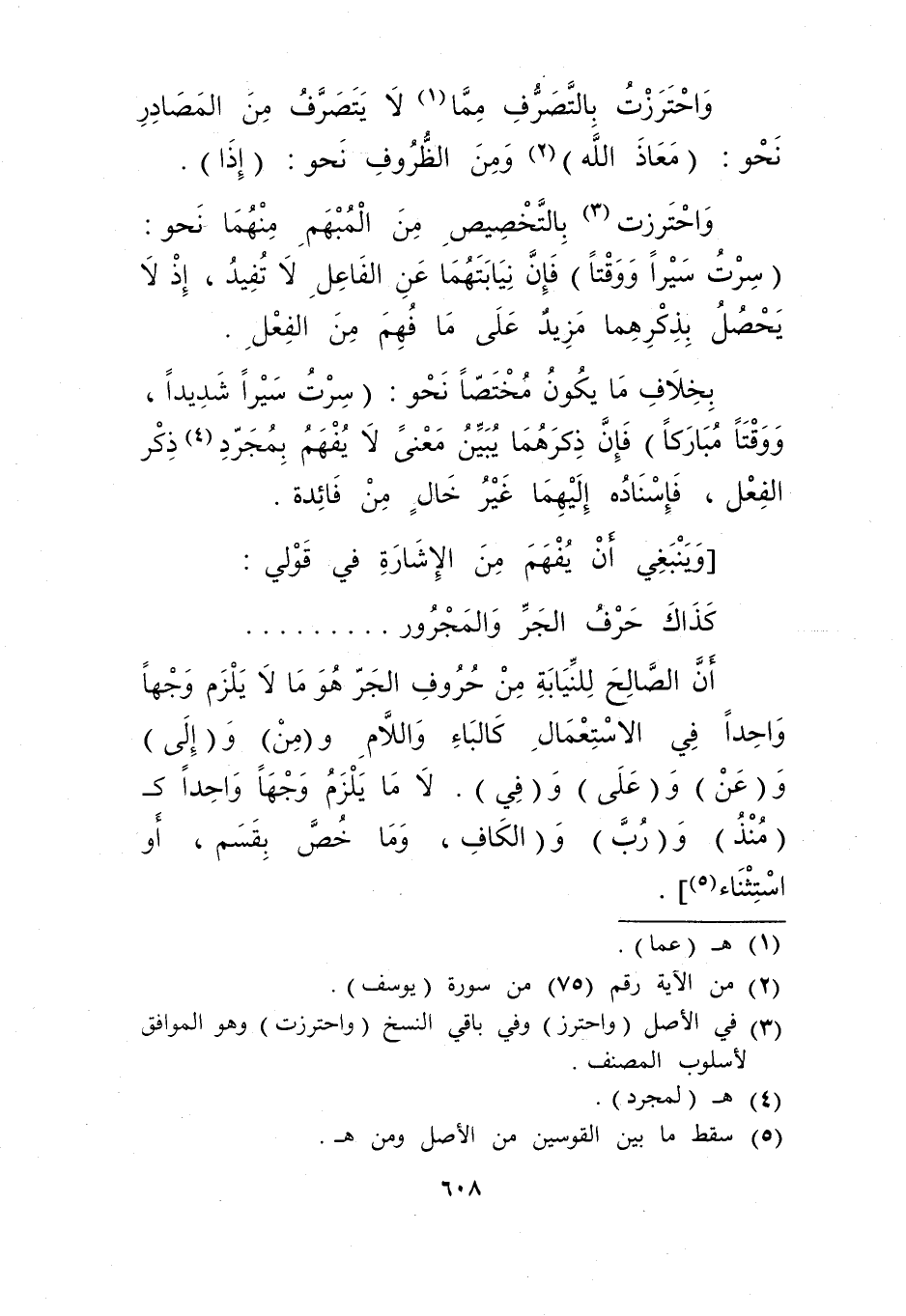 واحترزت بالتصرف مما1 لا يتصرف من المصادر نحو: "معاذ الله"2 ومن الظروف نحو: "إذا".