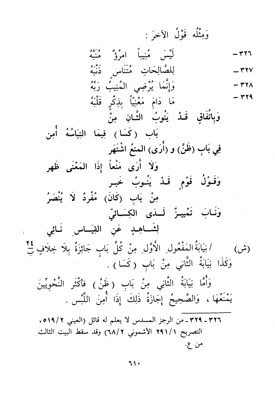 326، 329- من الرجز المسدس لا يعلم له قائل "العيني 2/ 519، التصريح 1/ 291 الأشموني 2/ 68" وقد سقط البيت الثالث من ع.