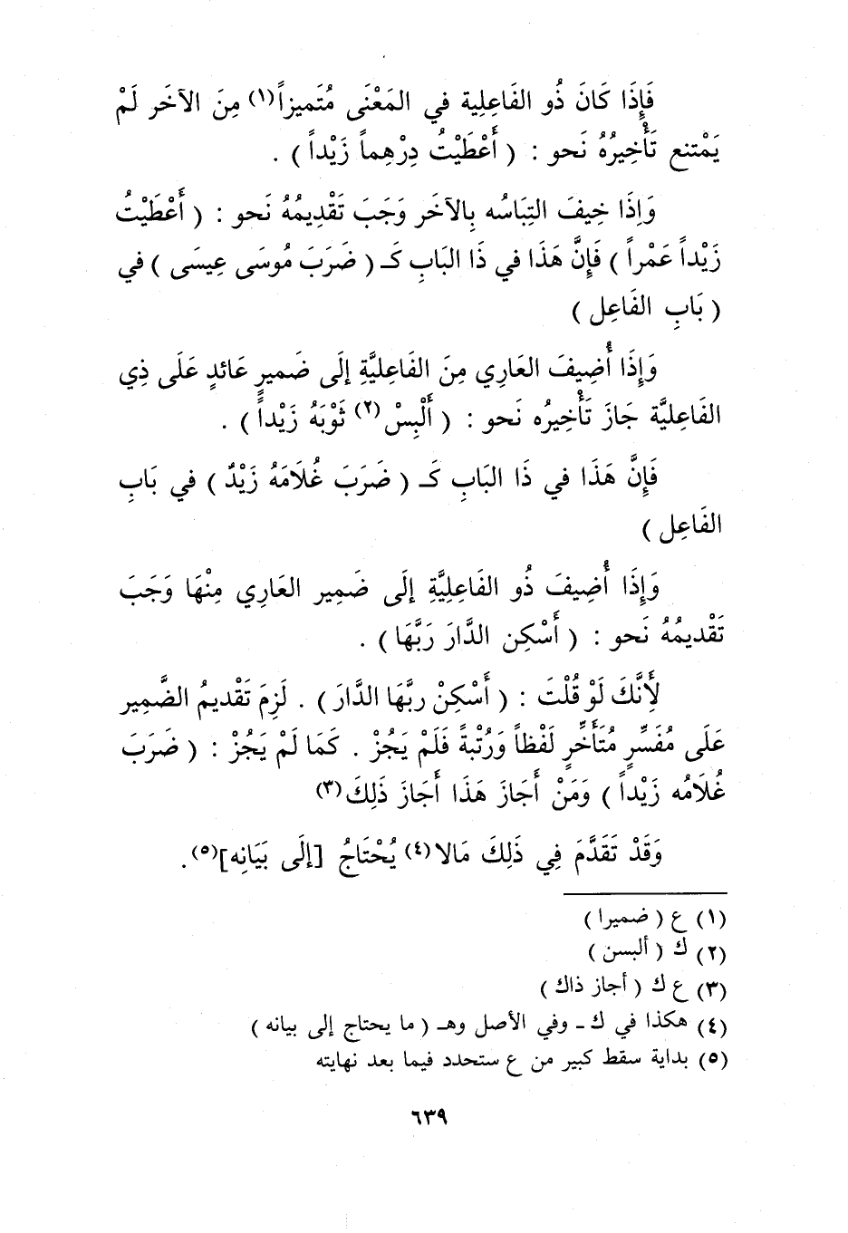 وإذا أضيف العاري من الفاعلية إلى ضمير عائد على ذي الفاعلية جاز تأخيره نحو: "ألبس2 ثوبه زيدا".