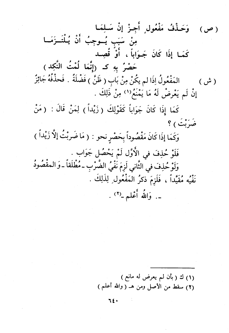 "ش": المفعول إذا لم يكن من باب "ظن" فضله. فحذفه جائز إن لم يعرض له ما يمنع1 من ذلك.
