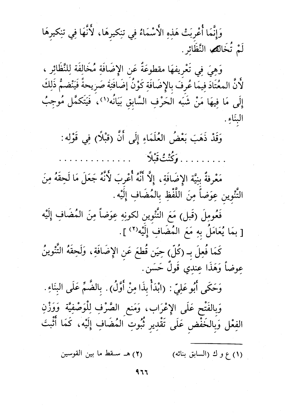 وهي في تعريفها مقطوعة عن الإضافة مخالفة للنظائر؛ لأن المعتاد فيما عرف بالإضافة كون إضافته صريحة فينضم ذلك إلى ما فيها من شبه الحرف السابق بيانه1، فيكتمل موجب البناء.