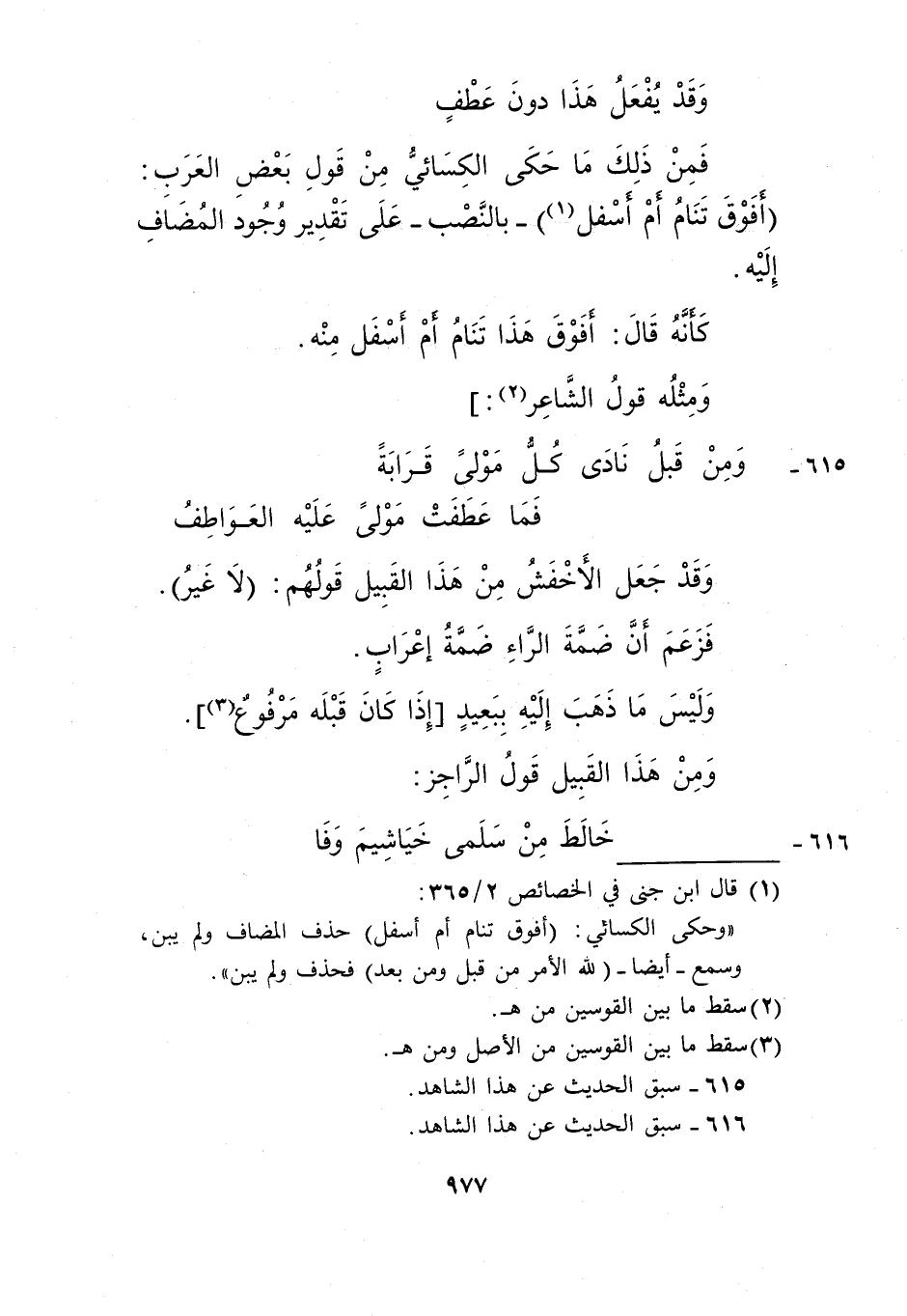 "وحكى الكسائي: "أفوق تنام أم أسفل" حذف المضاف ولم يبن، وسمع أيضا "لله الأمر من قبلٍ ومن بعدٍ" فحذف ولم يبن".