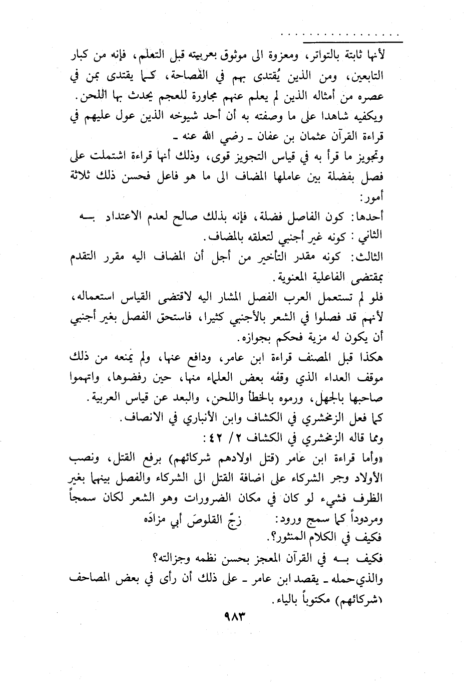 "وأما قراءة ابن عامر "قتل أولادهم شركائهم" برفع القتل، ونصب الأولاد وجر الشركاء على إضافة القتل إلى الشركاء والفصل بينهما بغير الظرف فشيء لو كان في مكان الضرورات وهو الشعر لكان سمجا ومردودا كما سمج ورد: