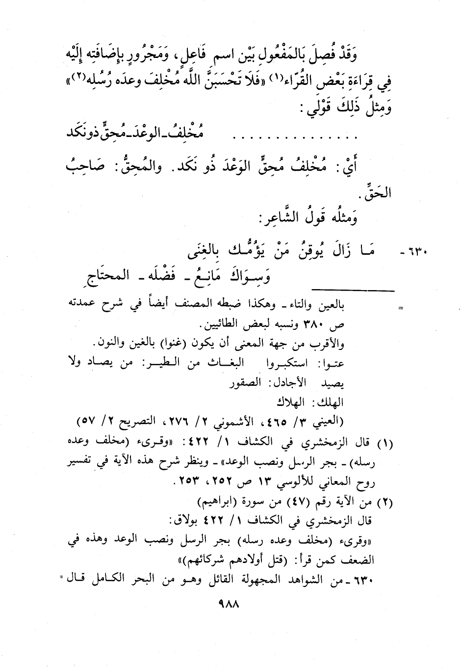 630- من الشواهد المجهولة القائل وهو من البحر الكامل قال المصنف في شرح العمدة 382، ومثل قراءة من قرأ "مخلف وعده رسلِه" قول الشاعر: ما زال....