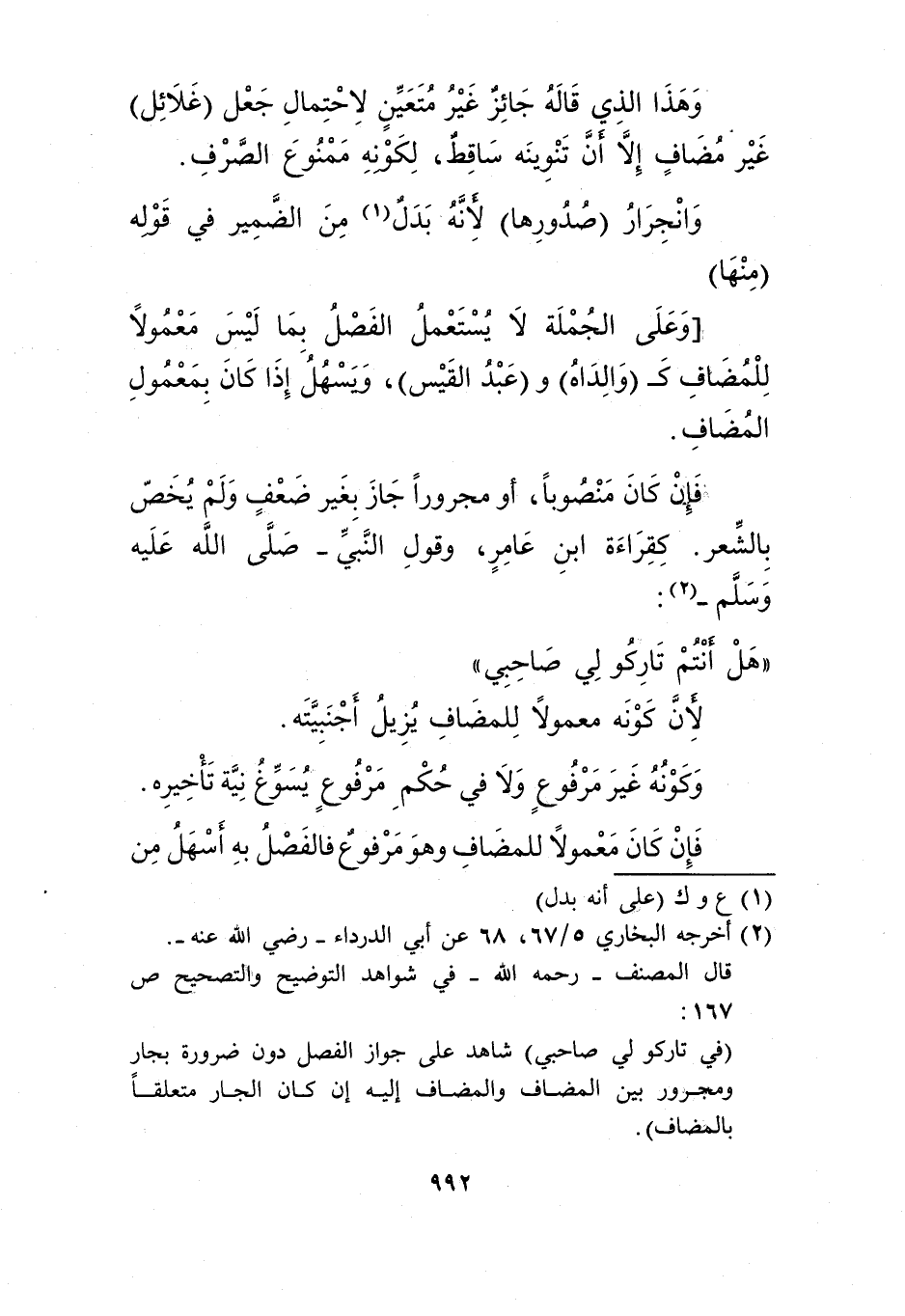 في "تاركو لي صاحبي" شاهد على جواز الفصل دون ضرورة بجار ومجرور بين المضاف والمضاف إليه إن كان الجار متعلقا بالمضاف.