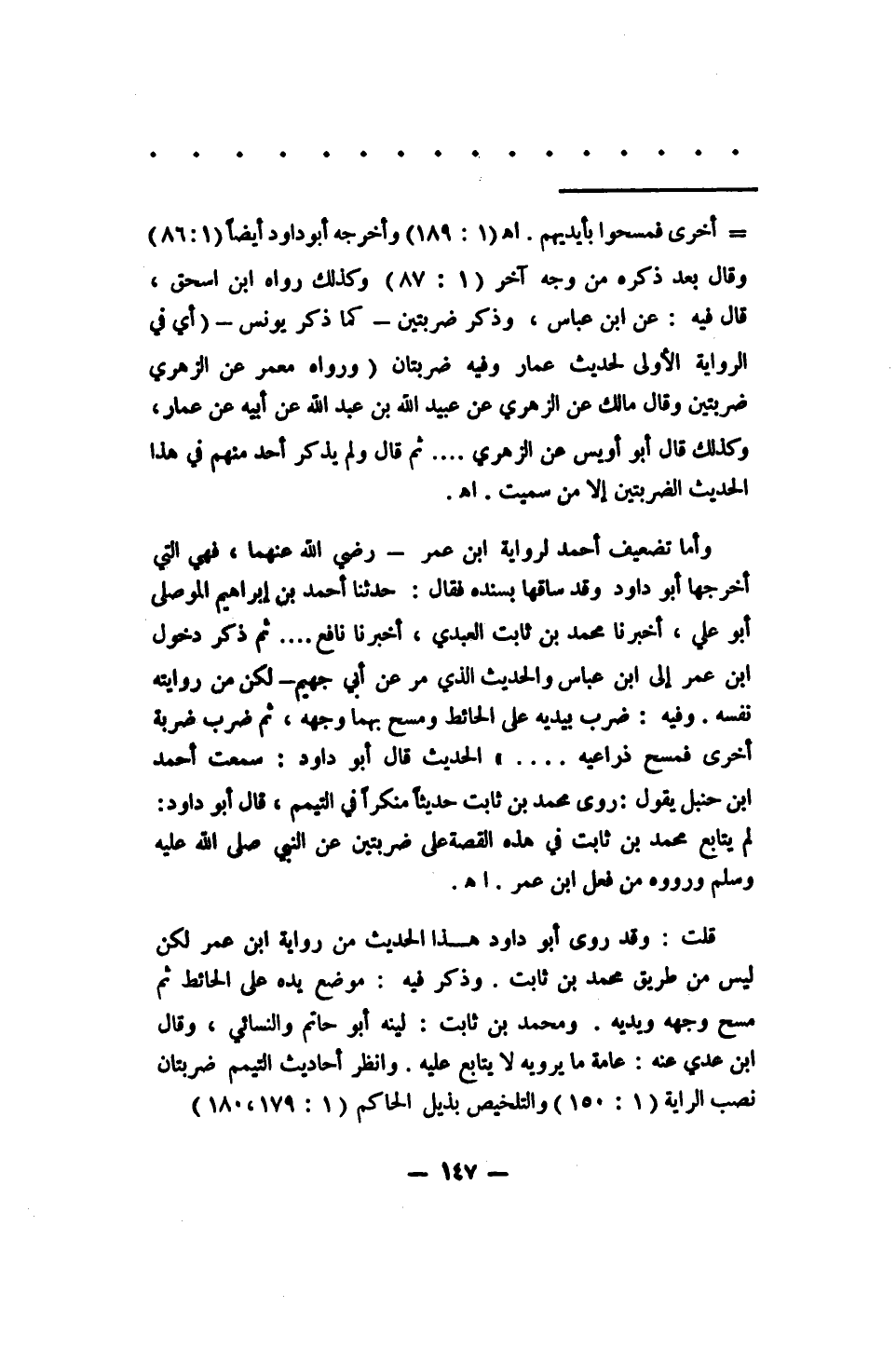أخرى فمسحوا بأيديهم. اهـ. (1: 189) وأخرجه أبو داود أيضا (1: 86) وقال بعد ذكره من وجه آخر (1: 87) : وكذلك رواه ابن إسحاق, قال فيه: عن ابن عباس, وذكر ضربتين - كما ذكر يونس - (أي في الرواية الأولى لحديث عمار وفيه ضربتان) ورواه معمر عن الزهري ضربتين، وقال مالك عن الزهري عن عبيد الله بن عبد الله عن أبيه عن عمار, وكذلك قال أبو أويس عن الزهري.... ثم قال: ولم يذكر أحد منهم في هذا الحديث الضربتين إلا من سميت. اهـ.
