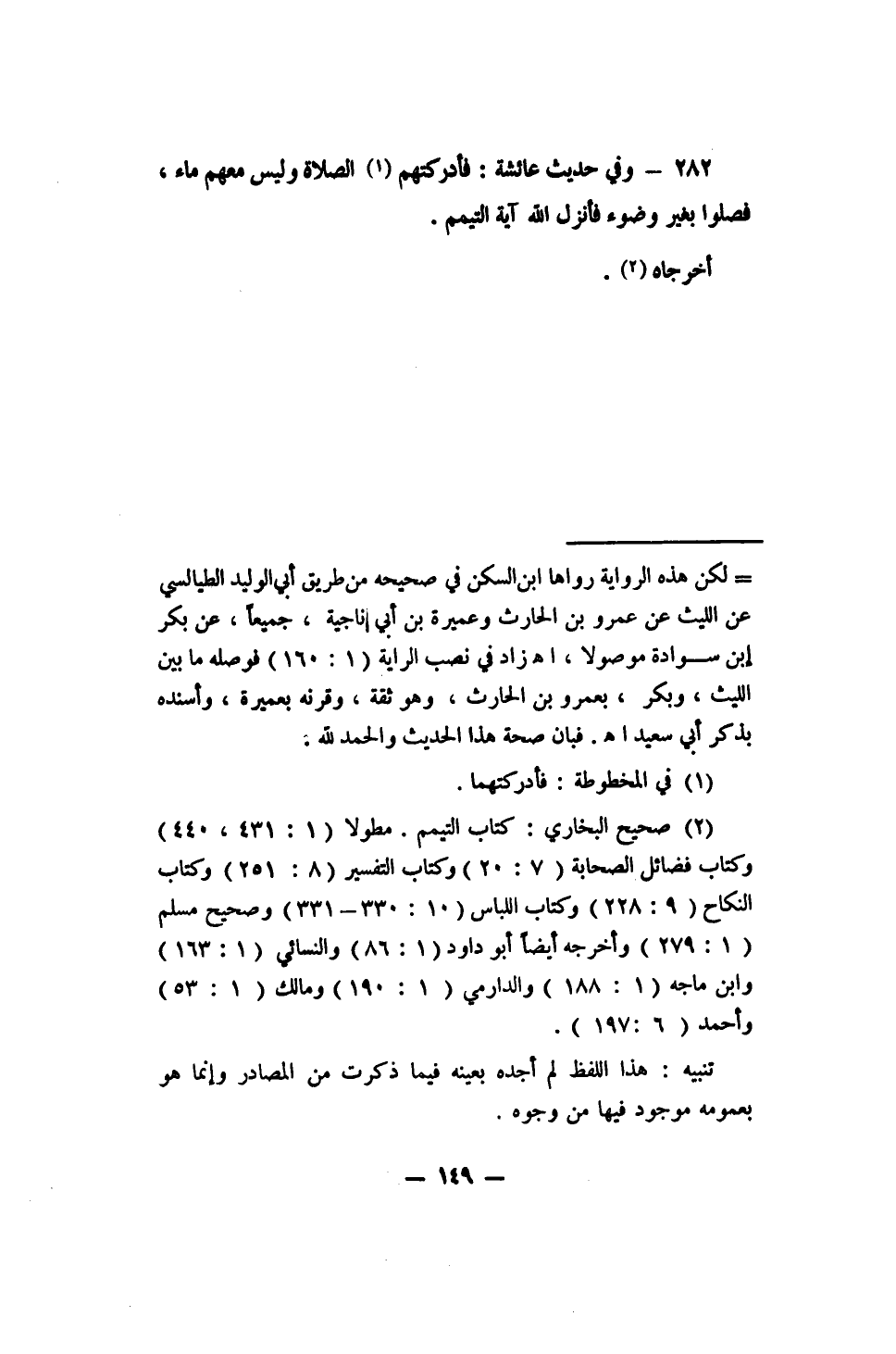 2 صحيح البخاري: كتاب التيمم. مطولا (1: 431, 440) وكتاب فضائل الصحابة (7: 20) وكتاب التفسير (8: 251) وكتاب النكاح (9: 228) وكتاب اللباس (10: 330-331) وصحيح مسلم (1: 279) وأخرجه أيضا أبو داود (1: 86) والنسائي (1: 163) وابن ماجه (1: 188) والدارمي (1: 190) ومالك (1: 53) وأحمد (6: 197) .