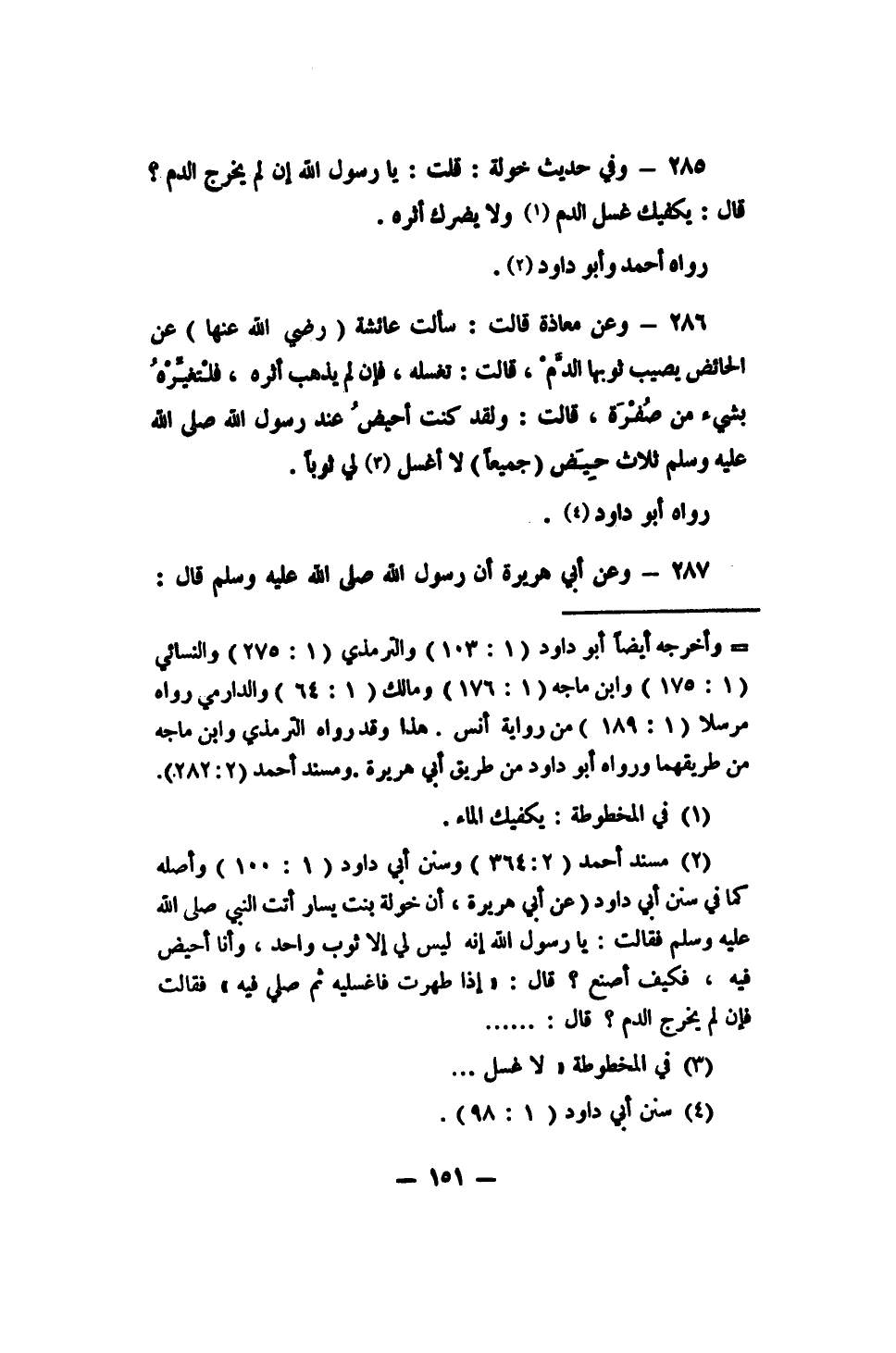 285 - وفي حديث خولة: (قلت: يا رسول الله إن لم يخرج الدم؟ قال: يكفيك غسل الدم 1 ولا يضرك أثره) .