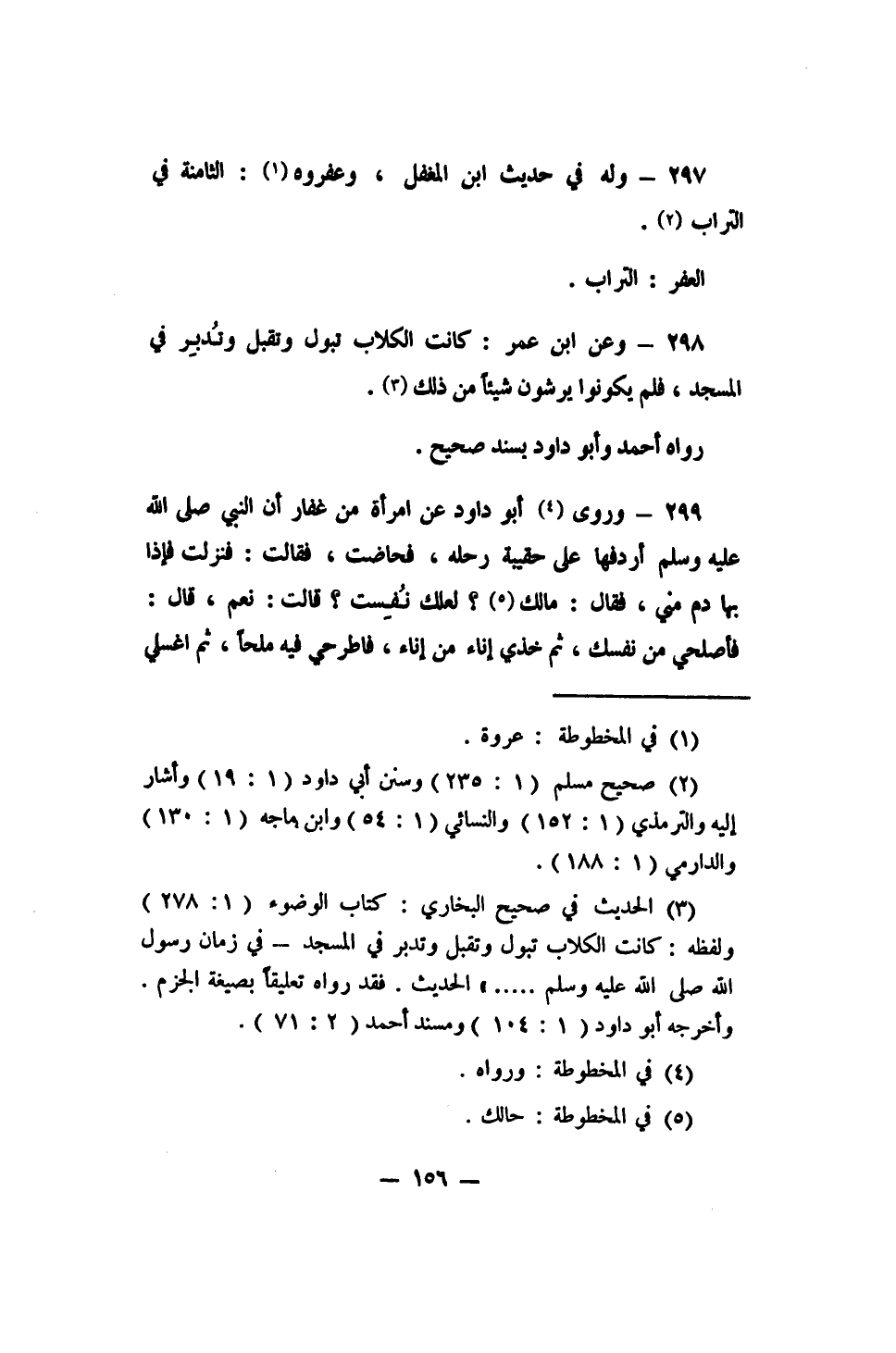 298 - وعن ابن عمر: (كانت الكلاب تبول وتقبل وتُدْبِر في المسجد، فلم يكونوا يرشون شيئاً من ذلك) 3.