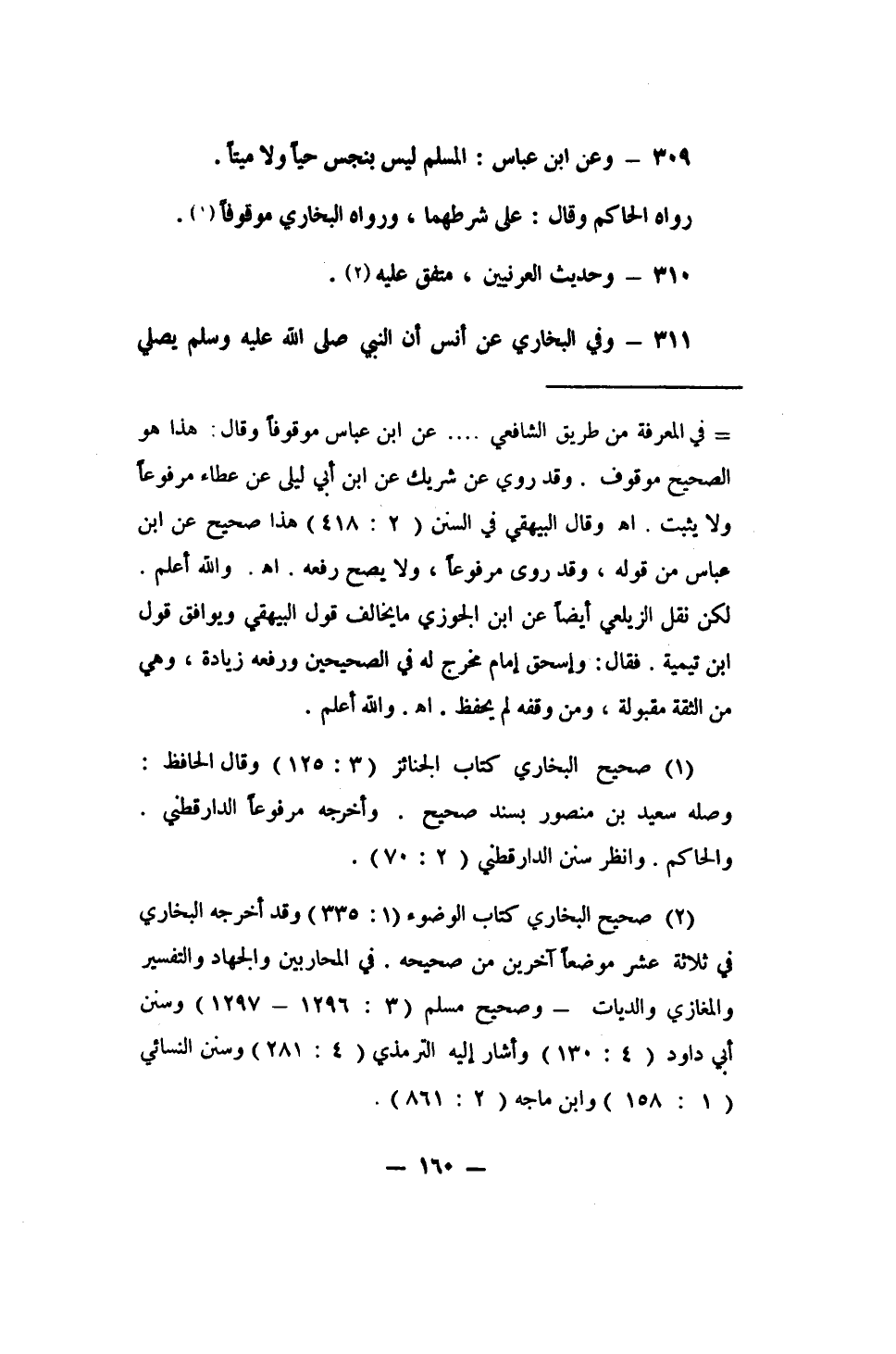 309 - وعن ابن عباس: (المسلم ليس بنجس حياً ولا ميتاً) .