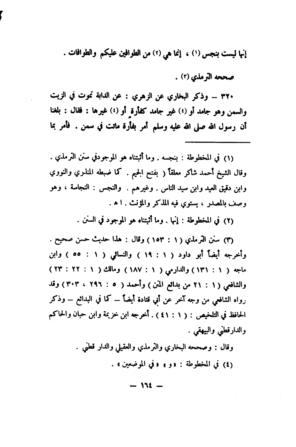 320 - وذكر البخاري عن الزهري: عن الدابة تموت في الزيت والسمن، وهو جامد أو 4 غير جامد كفأرةٍ أو غيرها: فقال: (بلغنا أن رسول الله صلى الله عليه وسلم أمر بفأرة ماتت في سمن. فأمر بما