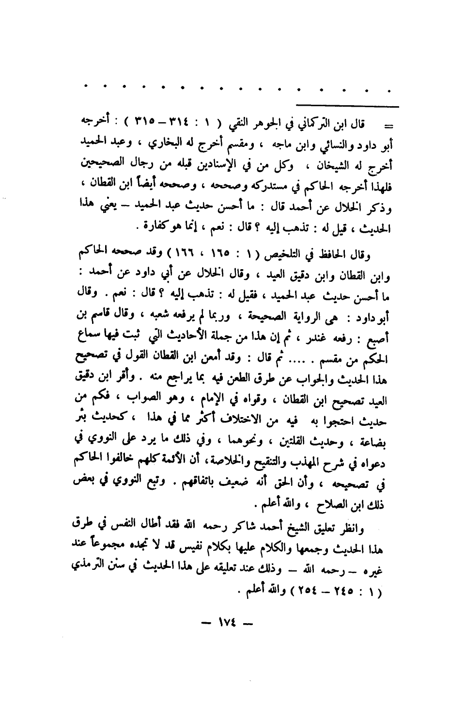 وقال الحافظ في التلخيص (1: 165, 166) وقد صححه الحاكم وابن القطان وابن دقيق العيد, وقال الخلال عن أبي داود عن أحمد: ما أحسن حديث عبد الحميد, فقيل له: تذهب إليه؟ قال: نعم. وقال أبو داود: هي الرواية الصحيحة, وربما لم يرفعه شعبة, وقال قاسم بن أصبع: رفعه غندر, ثم إن هذا من جملة الأحاديث التي ثبت فيها سماع الحكم من مقسم.... ثم قال: وقد أمعن ابن القطان القول في تصحيح هذا الحديث والجواب عن طرق الطعن فيه بما يراجع منه. وأقر ابن دقيق العيد تصحيح ابن القطان, وقواه في الإمام, وهو الصواب, فكم من حديث احتجوا به من الاختلاف أكثر مما في هذا, كحديث بئر بضاعة, وحديث القلتين, ونحوهما, وفي ذلك ما يرد على النووي في دعواه في شرح المهذب والتنقيح والخلاصة, أن الأئمة كلهم خالفوا الحاكم في تصحيحه, وأن الحق أنه ضعيف باتفاقهم. وتبع النووي في بعض ذلك ابن الصلاح, والله أعلم.
