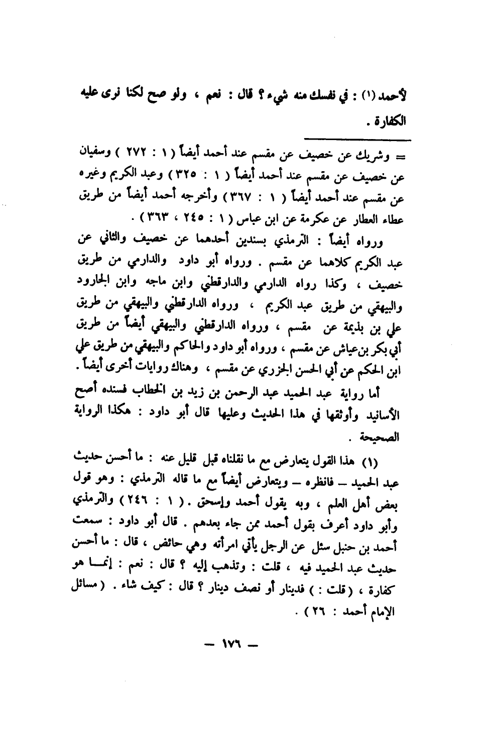 1 هذا القول يتعارض مع ما نقلناه قبل قليل عنه: ما أحسن حديث عبد الحميد - فانظره - ويتعارض أيضا مع ما قاله الترمذي: وهو قول بعض أهل العلم, وبه يقول أحمد وإسحاق. (1: 246) والترمذي وأبو داود أعرف بقول أحمد ممن جاء بعدهم. قال أبو داود: سمعت أحمد بن حنبل سئل عن الرجل يأتي امرأته وهي حائض, قال: ما أحسن حديث عبد الحميد فيه, قلت: وتذهب إليه؟ قال: نعم: إنما هو كفارة, (قلت:) فدينار أو نصف دينار؟ قال: كيف شاء. (مسائل الإمام أحمد: 26) .