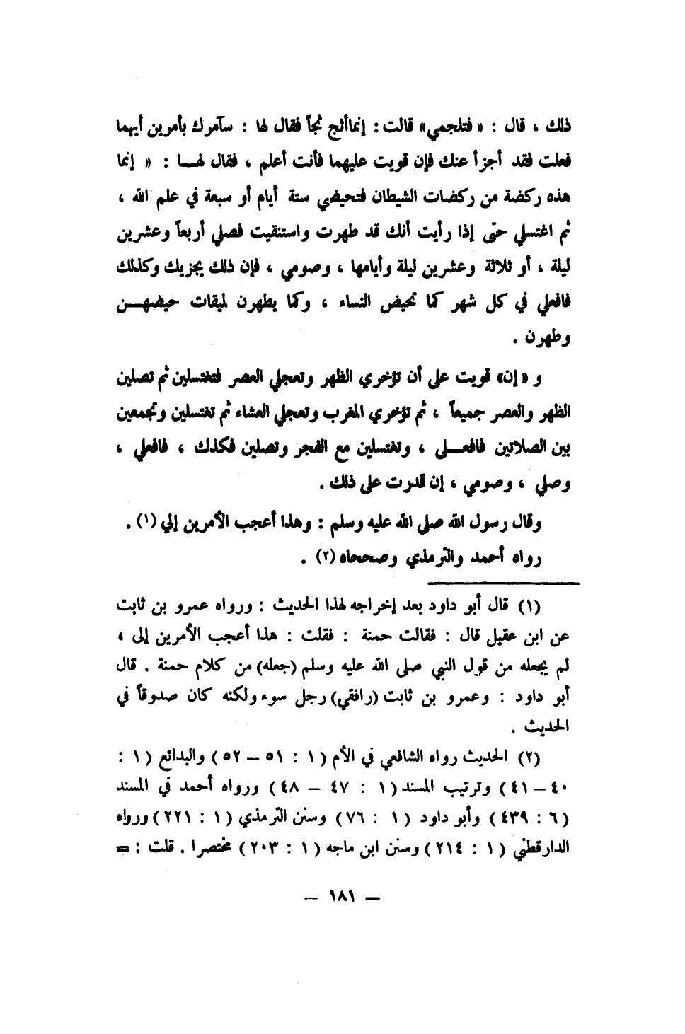 ذلك، قال: " فتلجمي " قالت: إنما أثج ثجاً. فقال لها: سآمرك بأمرين أيهما فعلت فقد أجزأ عنك، فإن قويت عليهما فأنت أعلم، فقال لها: " إنما هذه ركضة من ركضات الشيطان، فتحيضي ستة أيام أو سبعة في علم الله، ثم اغتسلي حتى إذا رأيت أنك قد طهرت واستنقيت فصلي أربعاً وعشرين ليلة، أو ثلاثة وعشرين ليلة وأيامها، وصومي، فإن ذلك يجزيك، وكذلك فافعلي في كل شهر كما تحيض النساء، وكما يطهرن لميقات حيضهن وطهرهن. و " إن " قويت على أن تؤخري الظهر وتعجلي العصر فتغتسلين ثم تصلين الظهر والعصر جميعاً، ثم تؤخري المغرب وتعجلي العشاء ثم تغتسلين وتجمعين بين الصلاتين فافعلي، وتغتسلين مع الفجر وتصلين فكذلك فافعلي، وصلي، وصومي، إن قدرت على ذلك. وقال رسول الله صلى الله عليه وسلم وهذا أعجب الأمرين إليَّ (1.