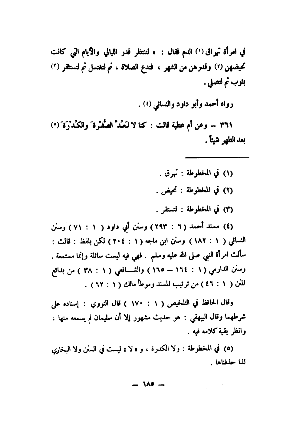4 مسند أحمد (293: 6) وسنن أبي داود (1: 71) وسنن النسائي (1: 182) وسنن ابن ماجه (1: 204) لكن بلفظ: قالت: سألت امرأة النبي صلى الله عليه وسلم. فهي فيه ليست سائلة وإنما مستمعة. وسنن الدارمي (1: 164-165) والشافعي (1: 38) من بدائع المنن (1: 46) من ترتيب المسند وموطأ مالك (1: 62) .