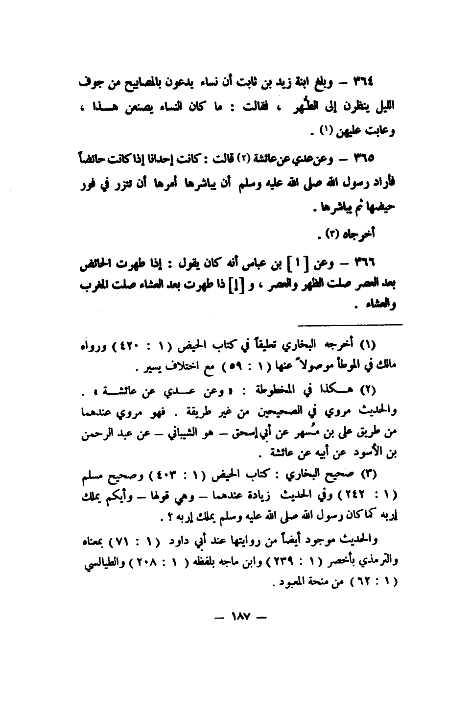 365 - وعن عدي عن عائشة 2 قالت: (كانت إحدانا إذا كانت حائضاً فأراد رسول الله صلى الله عليه وسلم أن يباشرها أمرها أن تتزر في فور حيضها ثم يباشرها) .