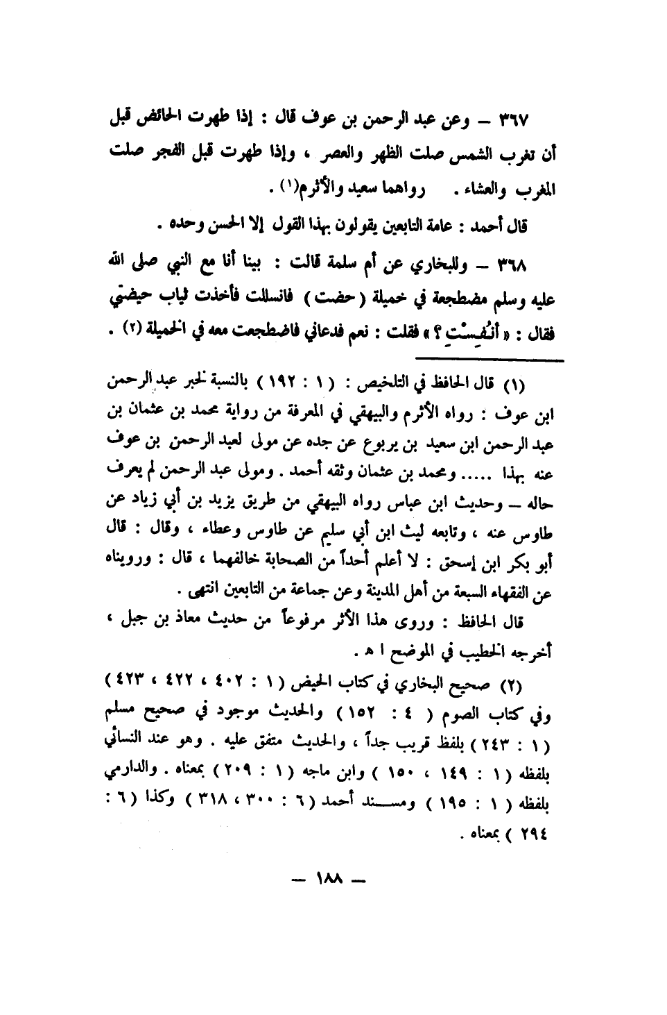 368 - وللبخاري عن أم سلمة قالت: (بينا أنا مع النبي صلى الله عليه وسلم مضطجعة في خميلة، (حضت) فانسللت فأخذت ثياب حيضتي فقال: " أنُفِسْتِ؟ " فقلت: نعم فدعاني فاضطجعت معه في الخميلة) 2.