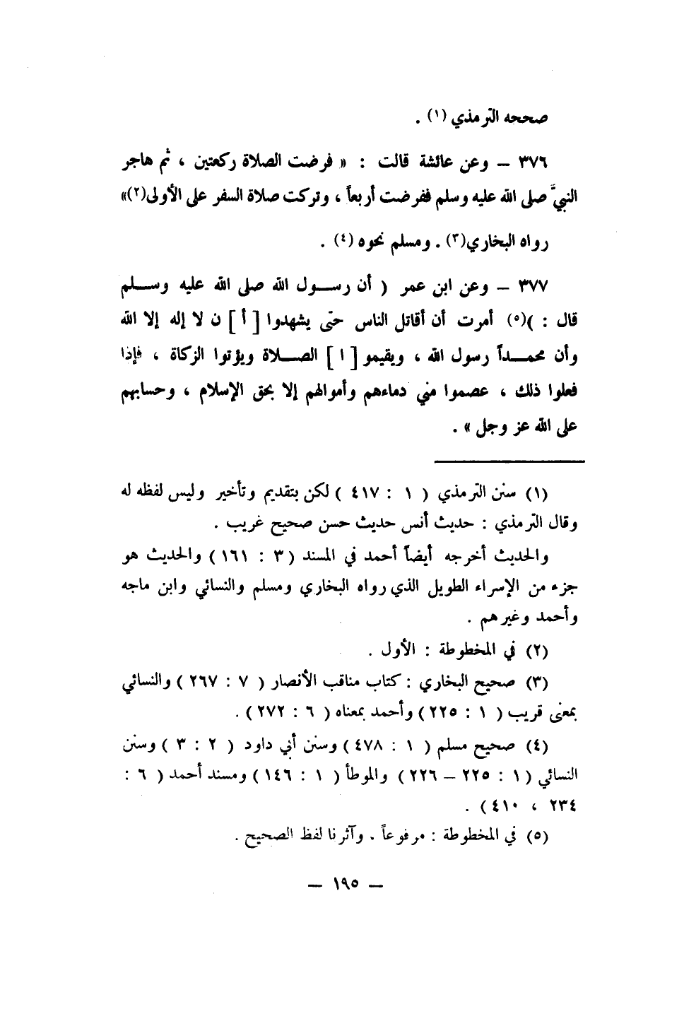 377 - وعن ابن عمر (أن رسول الله صلى الله عليه وسلم قال:) 5 (أمرت أن أقاتل الناس حتى يَشْهدوا أن لا إله إلا الله وأن محمدا رسول الله، ويقيموا الصلاة ويؤتوا الزكاة، فإذا فعلوا ذلك، عصموا مني دماءهم وأموالهم إلا بحق الإسلام، وحسابهم على الله عز وجل) .