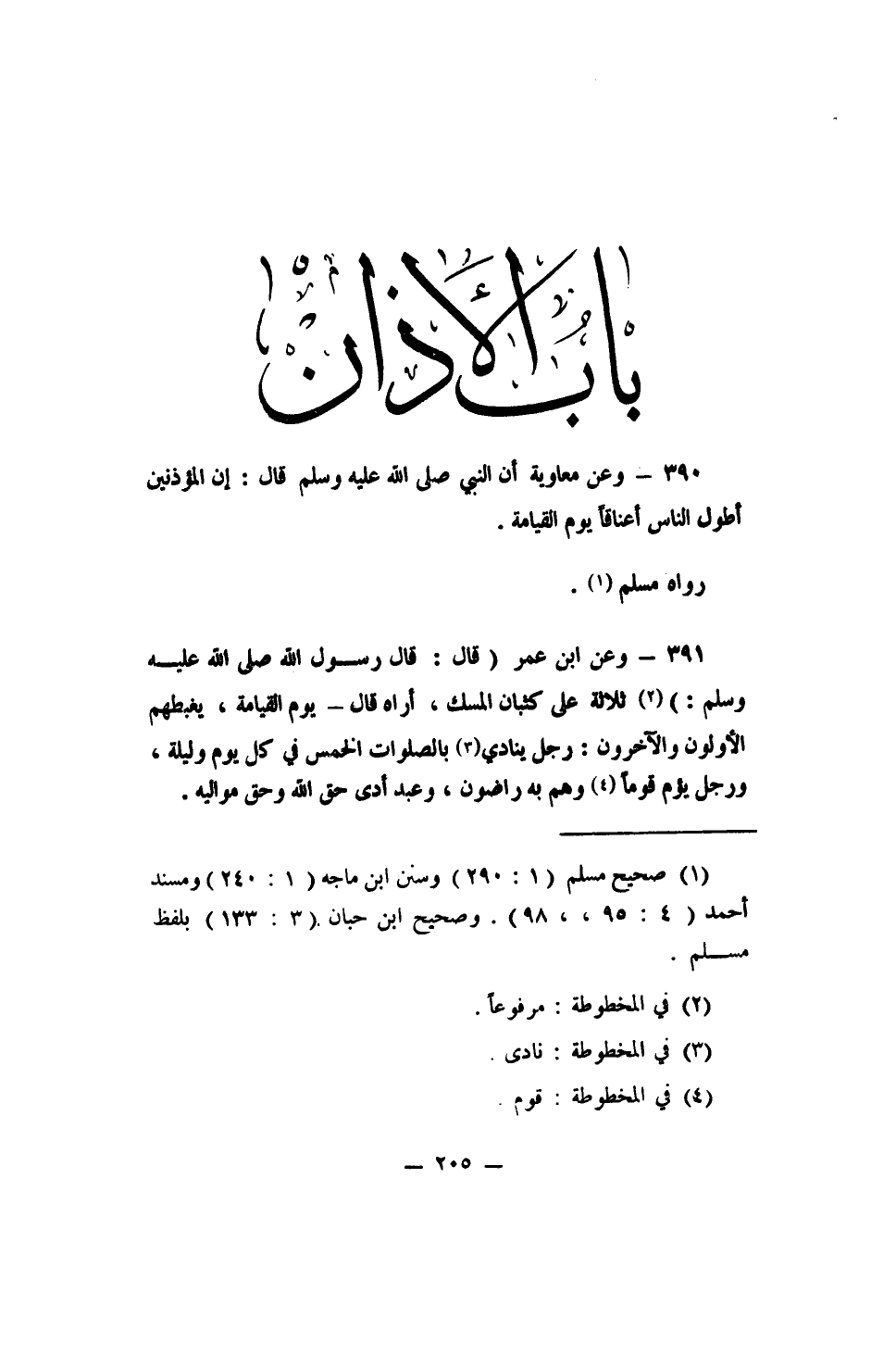 390 - وعن معاوية أن النبي صلى الله عليه وسلم قال: (إن المؤذنين أطول الناس أعناقاً يوم القيامة) .