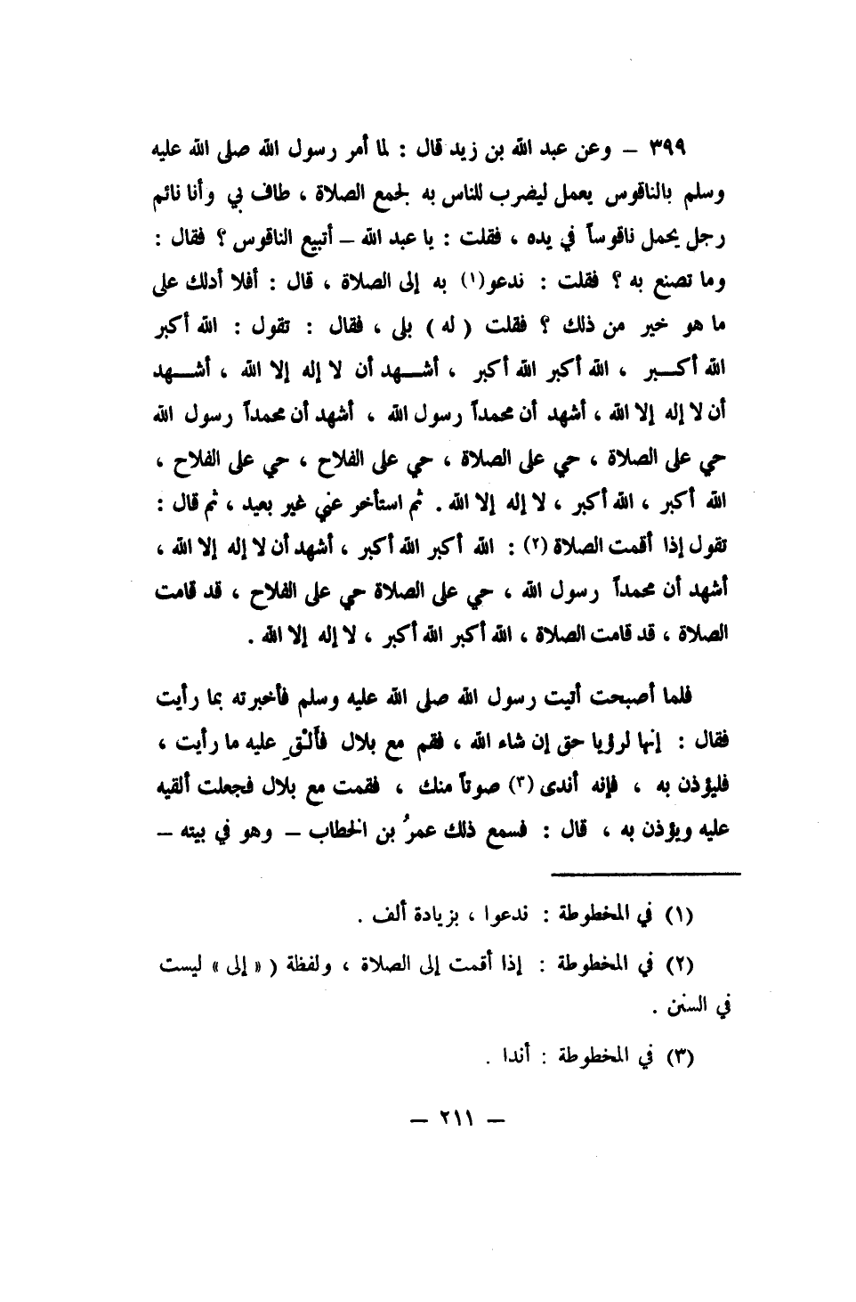 399- وعن عبد الله بن زيد قال: (لما أمر رسول الله صلى الله عليه وسلم بالناقوس يعمل ليضرب للناس به لجمع الصلاة، طاف بي وأنا نائم رجل يحمل ناقوساً في يده، فقلت: يا عبد الله، أتبيع الناقوس؟ فقال: وما تصنع به؟ فقلت: ندعو1 به إلى الصلاة، قال: أفلا أدلك على ما هو خير من ذلك؟ فقلت (له) : بلى، فقال: تقول: الله أكبر الله أكبر، الله أكبر الله أكبر، أشهد أن لا إله إلا الله، أشهد أن لا إله إلا الله، أشهد أن محمدا رسول الله، أشهد أن محمداً رسول الله، حي على الصلاة، حي على الصلاة، حي على الفلاح، حي على الفلاح، الله أكبر، الله أكبر، لا إله إلا الله. ثم استأخر عني غير بعيد، ثم قال: تقول إذا أقمت الصلاة2: الله أكبر الله أكبر، أشهد أن لا إله إلا الله، أشهد أن محمدا رسول الله، حي على الصلاة، حي على الفلاح، قد قامت الصلاة، قد قامت الصلاة، الله أكبر الله أكبر، لا إله إلا الله. فلما أصبحت أتيت رسول الله صلى الله عليه وسلم فأخبرته بما رأيت، فقال: إنها لرؤيا حق إن شاء الله، فقم مع بلال فأَلْقِ عليه ما رأيت، فليؤذن به، فإنه أند ى 3 صوتاً منك، فقمت مع بلال فجعلت ألقيه عليه ويؤذن به، قال: فسمع ذلك عمرُ بن الخطاب - وهو في بيته -