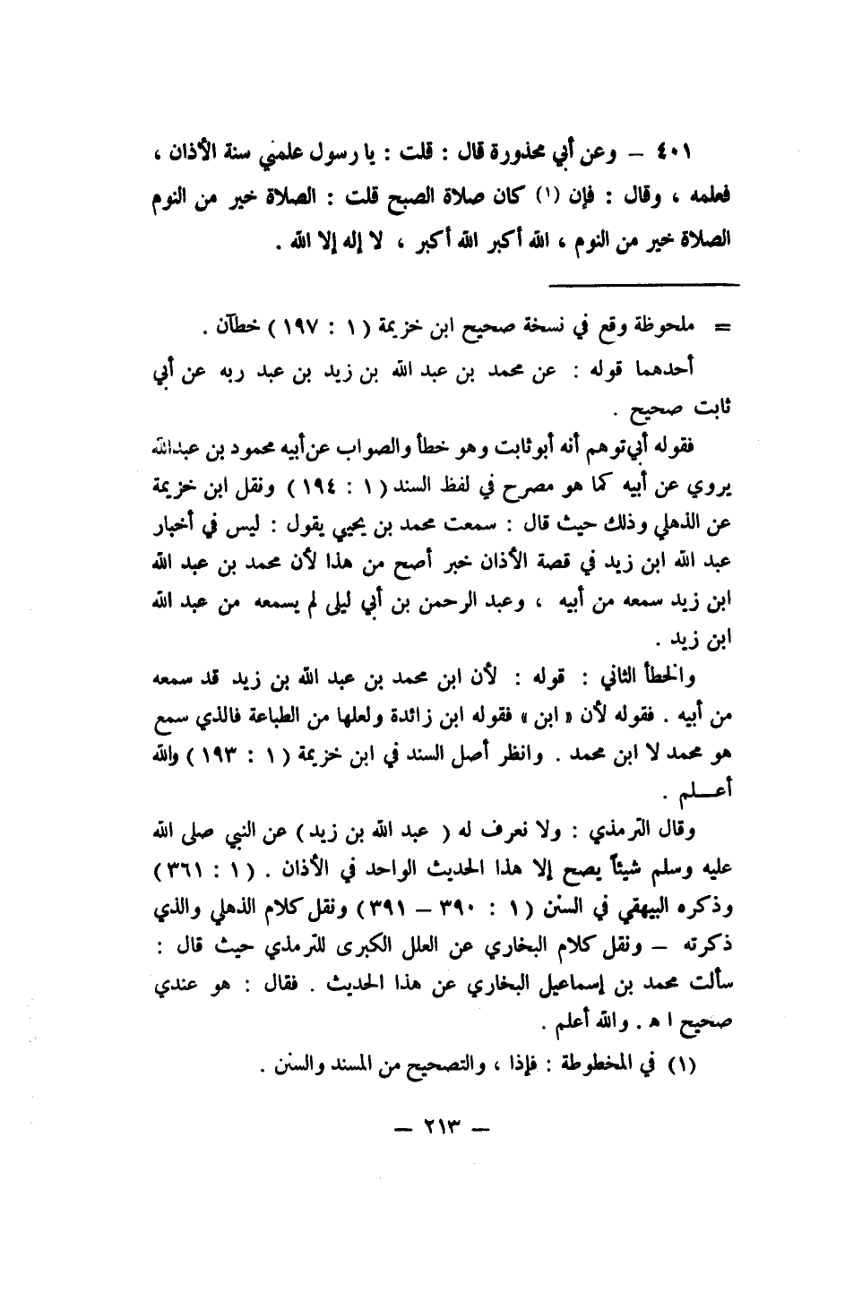 401 - وعن أبي محذورة قال: (قلت: يا رسول علمني سنة الأذان، فعلمه، وقال: فإن 1 كان صلاة الصبح قلت: الصلاة خير من النوم الصلاة خير من النوم، الله أكبر الله أكبر، لا إله إلا الله) .