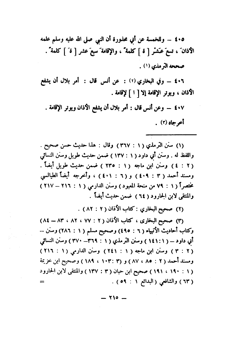 3 صحيح البخاري, كتاب الأذان (2: 77 , 82 , 83- 84) وكتاب أحاديث الأنبياء (6: 495) وصحيح مسلم (1: 286) وسنن أبي داود (1: 141) وسن الترمذي (1: 369- 370) وسنن النسائي (2: 3) وسنن ابن ماجه (1: 241) وسنن الدارمي (1: 216) ومسند أحمد (2: 85 , 87) و (3: 103 , 189) وصحيح ابن خزيمة (1: 190 , 191) وصحيح ابن حبان (3: 137) والمنتقى لابن الجارود (63) والشافعي: البدائع (1: 59) . ملحوظة: وقع في سنن النسائي (2: 3) وفي صحيح ابن حبان (3: 138) هذا الحديث بتصريح الآمر لبلال وهو النبي صلى الله عليه وسلم، ففيهما عن أنس: "أن رسول الله صلى الله عليه وسلم أمر بلالا أن يشفع الأذان ويوتر الإقامة". اهـ.