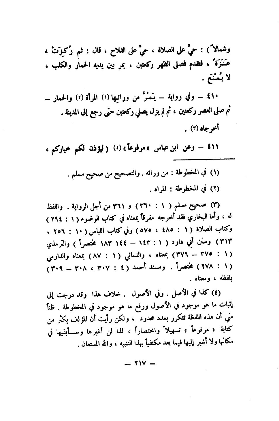 4 كذا في الأصل. وفي الأصول خلاف هذا، وقد درجت إلى إثبات ما هو موجود في الأصول ورفع ما هو موجود في المخطوطة، ظنا مني أن هذه اللفظة تتكرر بعدد محدود, ولكن رأيت أن المؤلف يكثر من كتابة "مرفوعا" تسهيلا واختصارا, لذا لن أغيرها وسأبقيها في مكانها ولا أشير إليها فيما بعد مكتفيا بهذا التنبيه, والله المستعان.