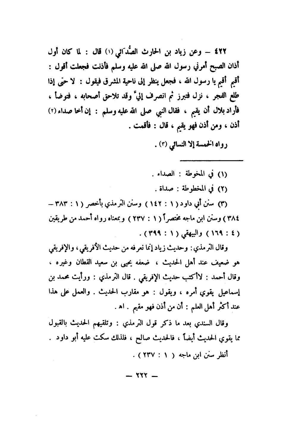 3 سنن أبي داود (1: 142) وسنن الترمذي بأخصر (1: 383- 384) وسنن ابن ماجه مختصرا (1: 237) وبمعناه رواه أحمد من طريقين (4: 169) والبيهقي (1: 399) .