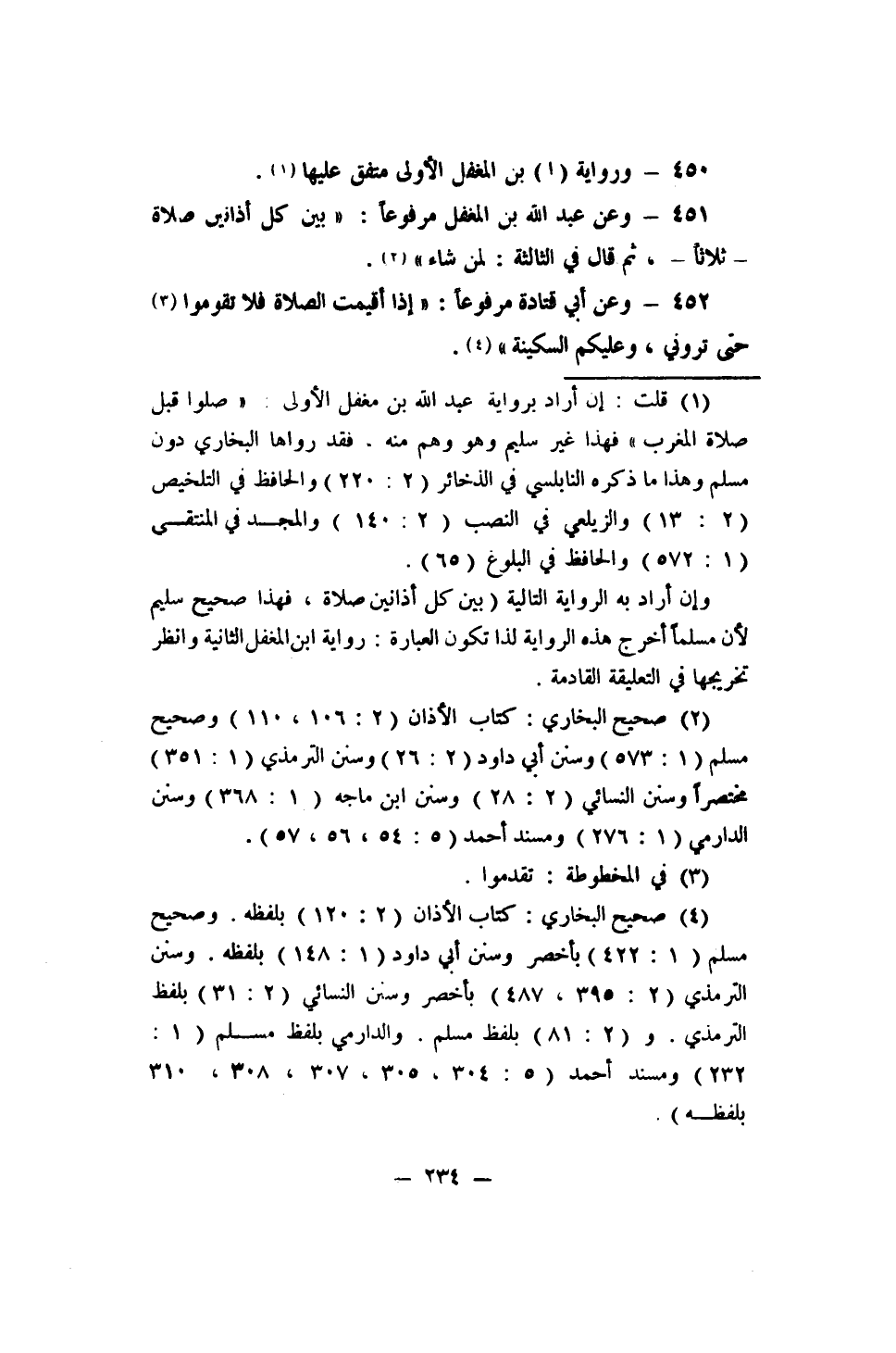 451 - وعن عبد الله بن المغفل مرفوعاً: (بين كل أذانين صلاة - ثلاثا -، ثم قال في الثالثة: لمن شاء) 2.