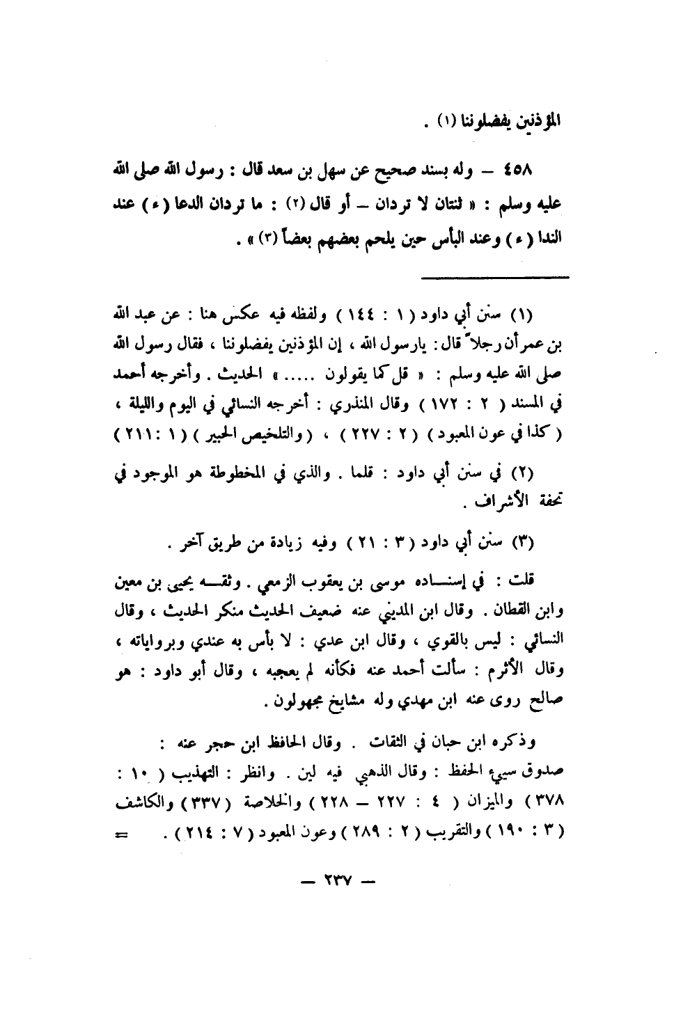 458- وله بسند صحيح عن سهل بن سعد قال: رسول الله صلى الله عليه وسلم (ثنتان لا تردان - أو قال 2 ما تردان الدعا (ء) عند الندا (ء) وعند البأس حين يلحم بعضهم بعضاً) 3.