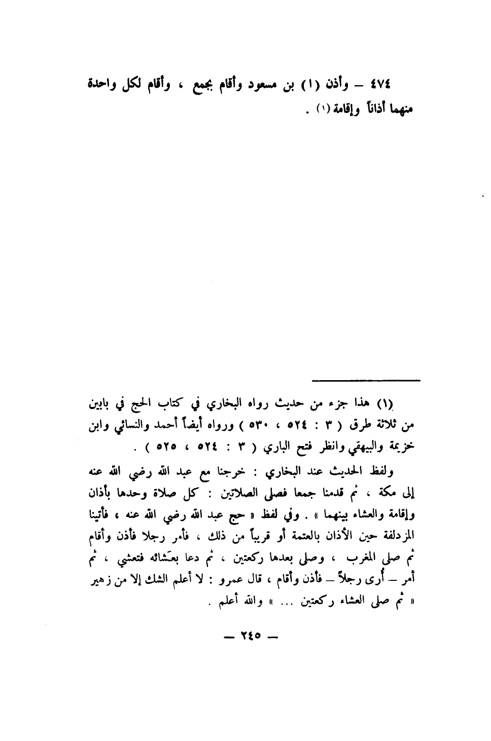 474 - (وأذن (ا) بن مسعود وأقام بجمع، وأقام لكل واحدة منهما أذانا وإقامة) 1.