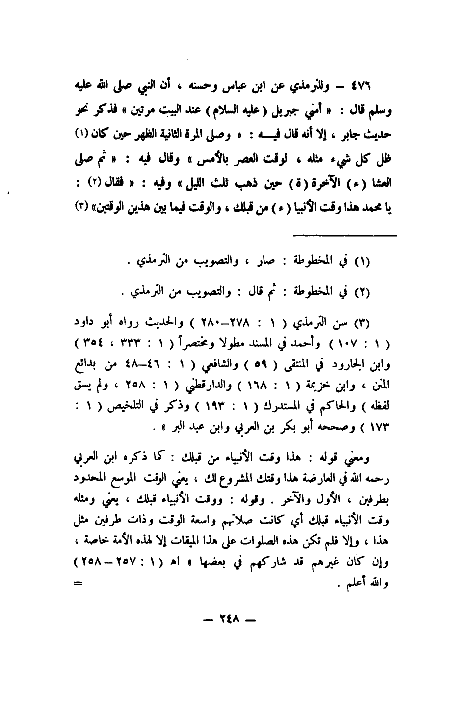 476 - وللترمذي عن ابن عباس وحسنه: (أن النبي صلى الله عليه وسلم قال: أمني جبريل (عليه السلام) عند البيت مرتين (فذكر نحو حديث جابر، إلا أنه قال فيه: ("وصلى المرة الثانية الظهر حين كان 1 ظل كل شيء مثله، لوقت العصر بالأمس " وقال فيه: " ثم صلى العشا (ء) الآخر (ة) حين ذهب ثلث الليل " وفيه: " فقال 2 يا محمد هذا وقت الأنبياء من قبلك، والوقت فيما بين هذين الوقتين) 3.