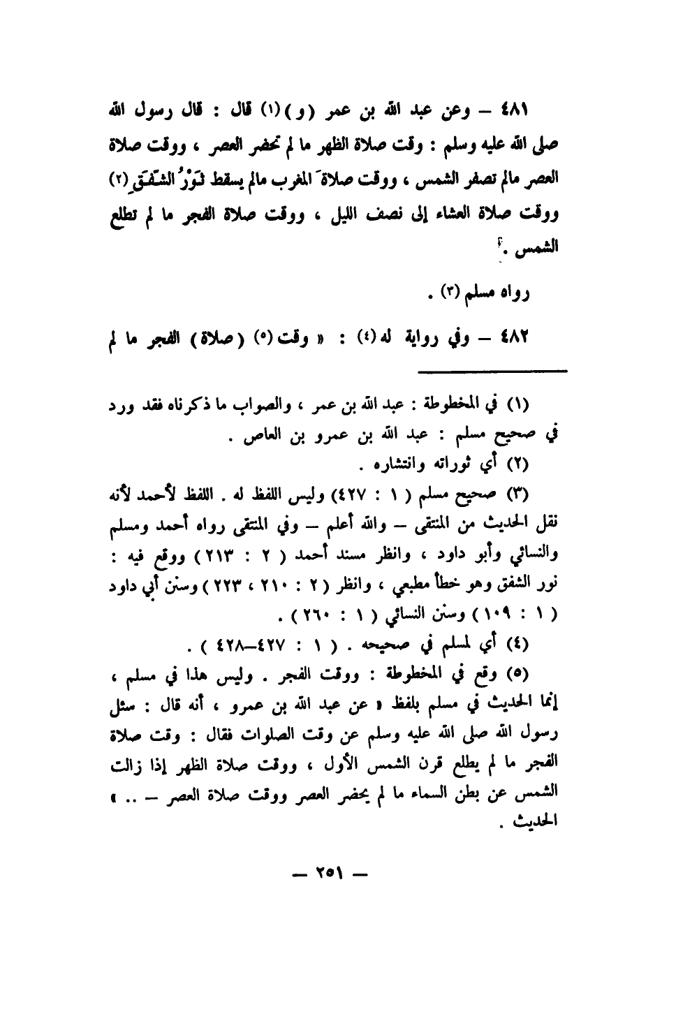 481 - وعن عبد الله بن عَمرو 1 قال: قال رسول الله صلى الله عليه وسلم: (وقت صلاة الظهر ما لم تحضر العصر، ووقت صلاة العصر ما لم تصفر الشمس، ووقت صلاةَ المغرب ما لم يسقط ثَوْرُ الشَّفق، 2 ووقت صلاة العشاء إلى نصف الليل، ووقت صلاة الفجر ما لم تطلع الشمس) .