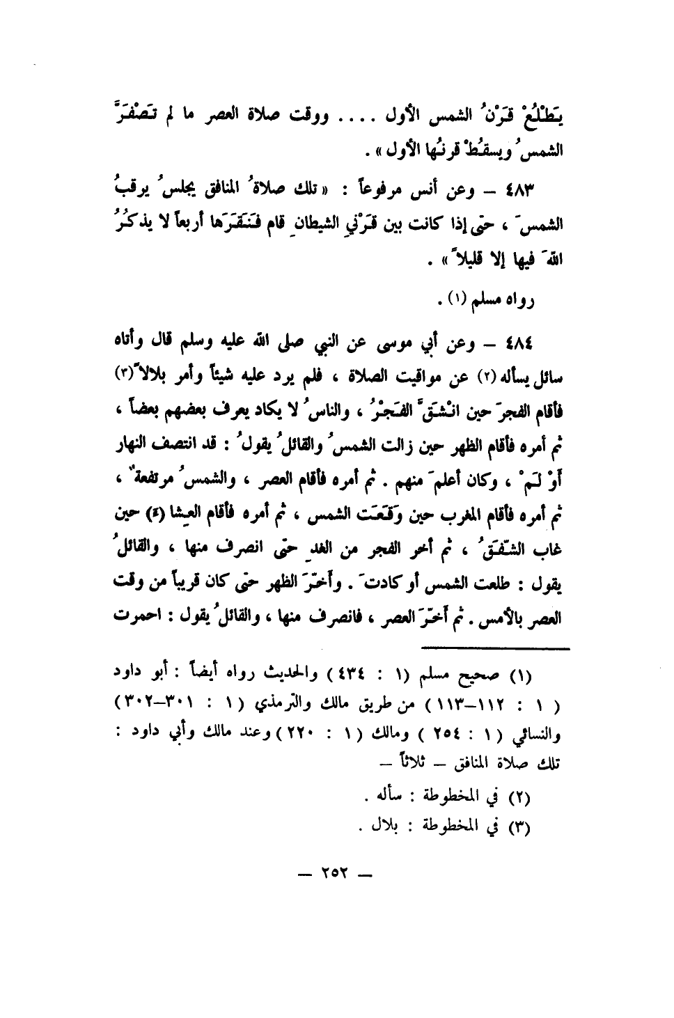 1 صحيح مسلم (1: 434) والحديث رواه أيضا: أبو داود (1: 112- 113) من طريق مالك، والترمذي (1: 301- 302) والنسائي (1: 254) ومالك (1: 220) وعند مالك وأبي داود: تلك صلاة المنافق -ثلاثا-.