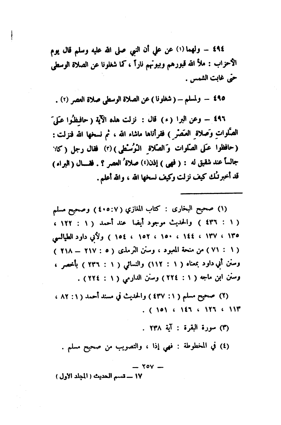 496 - وعن البرا (ء) قال: (نزلت هذه الآية: {حافِظُوا عَلَى الصَّلواتِ وصلاةِ العَصْرِ} فقرأناها ما شاء الله، ثم نسخها الله فنزلت: {حَافِظُوا عَلَى الصَّلَوَاتِ وَالصَّلاةِ الْوُسْطَى} 3 فقال رجل (كان جالساً عند شقيق له) : (فهي) إذن4 صلاةُ العصر؟. فقال (البراء) قد أخبرتُك كيف نزلت وكيف نسخها الله، والله أعلم) .