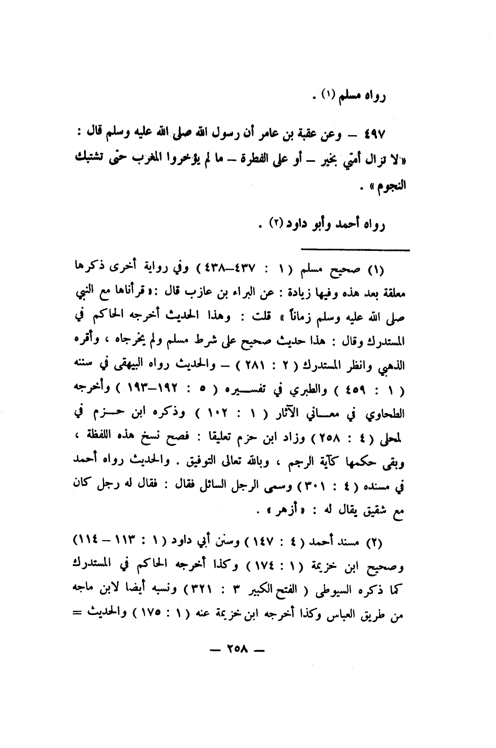 497 - وعن عقبة بن عامر أن رسول الله صلى الله عليه وسلم قال: (لا تزال أمتي بخير - أو على الفطرة - ما لم يؤخروا المغرب حتى تشتبك النجوم) .