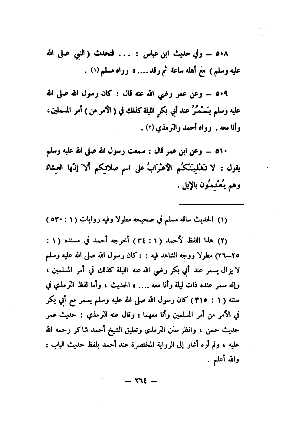 510 -وعن ابن عمر قال: (سمعت رسول الله صلى الله عليه وسلم يقول: لا تَغْلِبَنَّكُم الأعرابُ على اسم صلاتِكم، ألا إنّها العِشَاء وهم يُعْتِمُون بالإبل) .