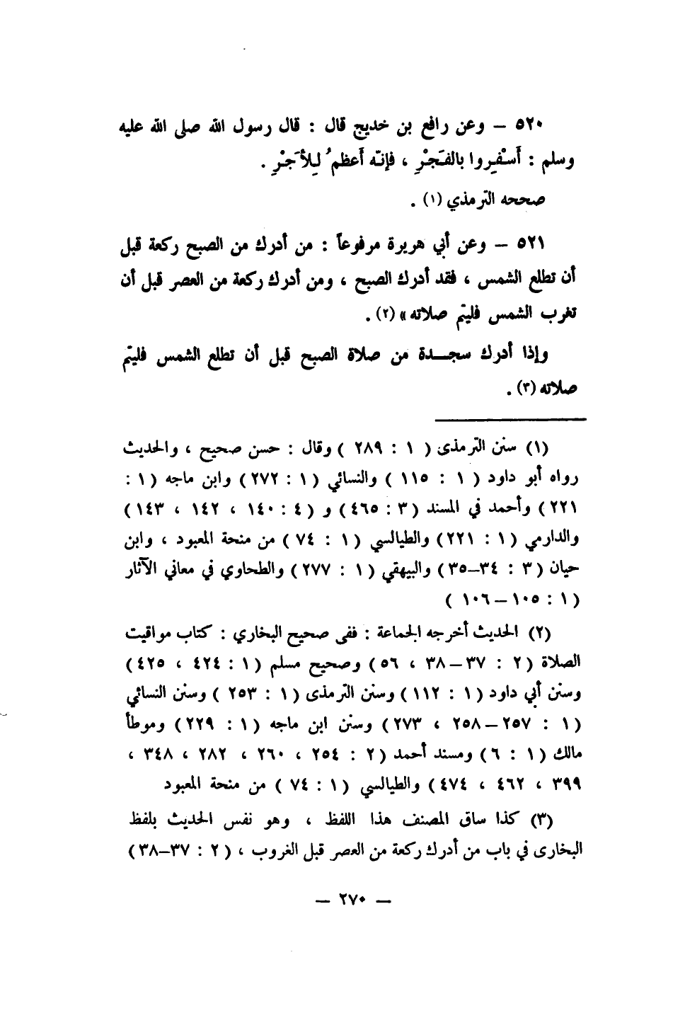 521 - وعن أبي هريرة مرفوعاً: (من أدرك من الصبح ركعة قبل أن تطلع الشمس، فقد أدرك الصبح، ومن أدرك ركعة من العصر قبل أن تغرب الشمس فليتم صلاته 2.