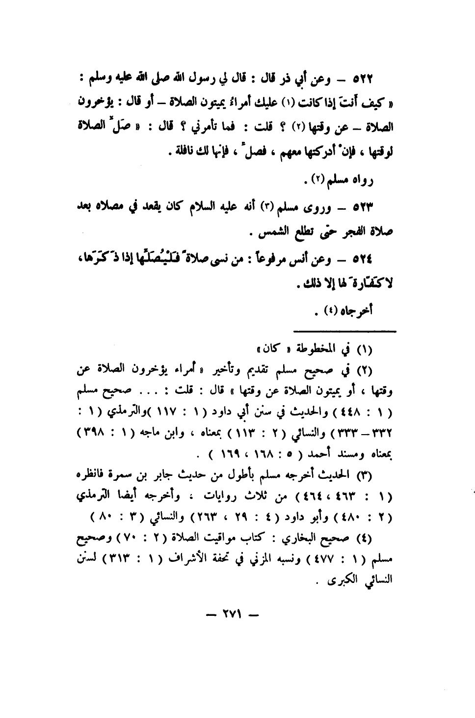 522 - وعن أبي ذر قال: قال لي رسول الله صلى الله عليه وسلم: (كيف أنت إذا كانت 1 عليك أمراءُ يميتون الصلاة - أو قال: يؤخرون الصلاة - عن وقتها 2؟ قلت: فما تأمرني؟ قال: " صَلِّ الصلاة لوقتها، فإن أدركتها معهم، فصلِّ، فإنها لك نافلة) .