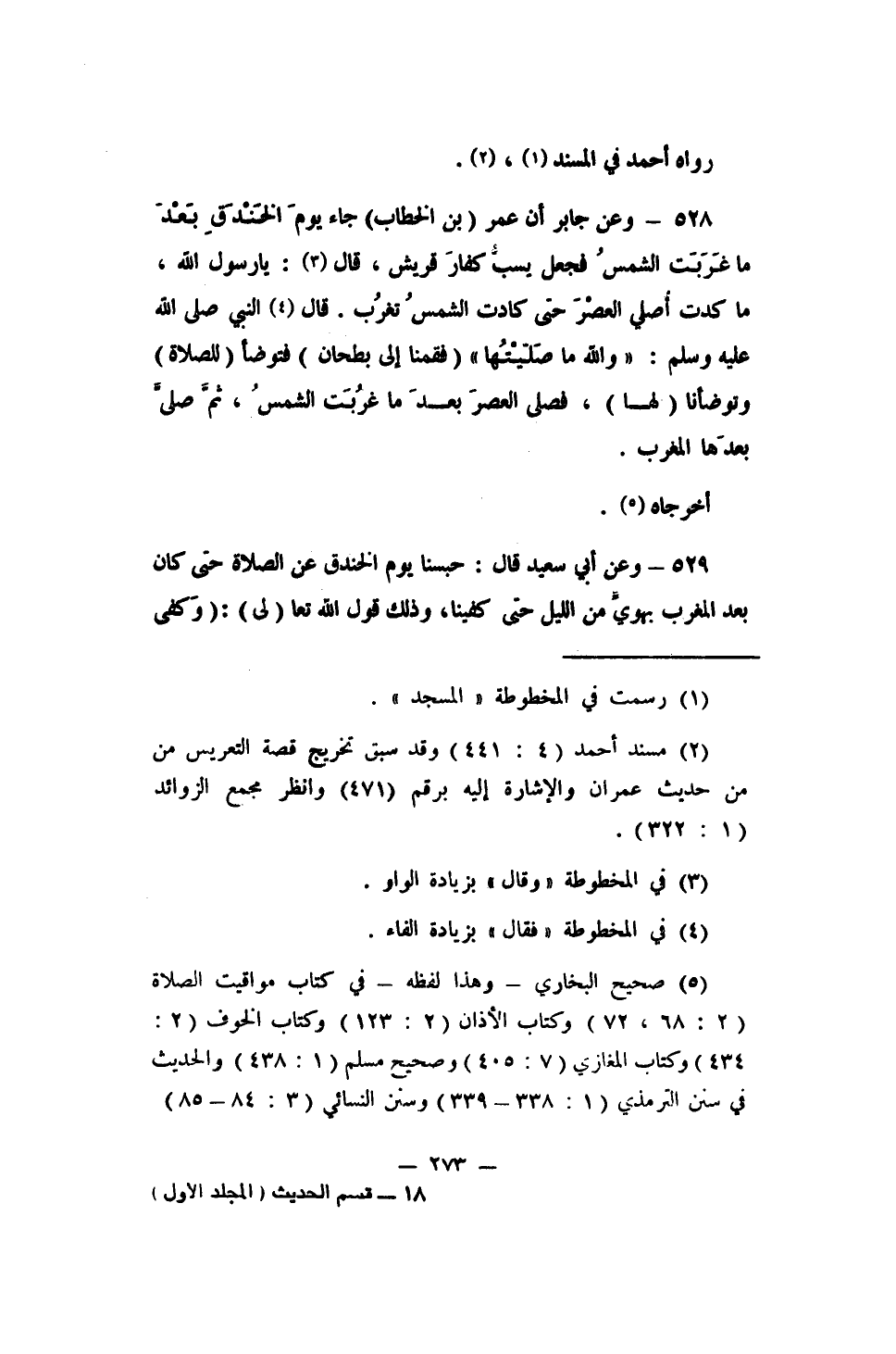 5 صحيح البخاري -وهذا لفظه- في كتاب مواقيت الصلاة (2: 68 , 72) وكتاب الأذان (2: 123) وكتاب الخوف (2: 434) وكتاب المغازي (7: 405) وصححه مسلم (1: 438) والحديث في سنن الترمذي (1: 338- 339) وسنن النسائي (3: 84- 85)