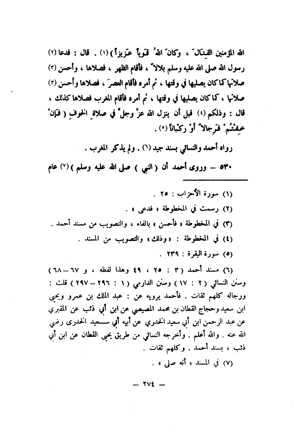 اللَّهُ الْمُؤْمِنِينَ الْقِتَالَ وَكَانَ اللَّهُ قَوِيّاً عَزِيزاً} 1 قال: فدعا 2 رسول الله صلى الله عليه وسلم بلالاً، فأقام الظهر، فصلاها، وأحسن 3 صلاتها كما كان يصليها في وقتها، ثم أمره فأقام العصرَ، فصلاها وأحسن 3 صلاتها، كما كان يصليها في وقتها، ثم أمره فأقام المغرب فصلاها كذلك، قال: وذلكم 4 قبل أن ينزل الله عزَّ وجلَّ في صلاةِ الخوفِ {فَإِنْ خِفْتُمْ فَرِجَالاً أَوْ رُكْبَاناً} 5) .
