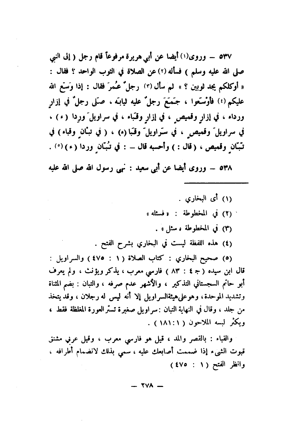 537 - وروى 1 أيضا عن أبي هريرة مرفوعاً: (قام رجل (إلى النبي صلى الله عليه وسلم) فسأله 2 عن الصلاة في الثوب الواحد؟ فقال: " أوكلكم يجد ثوبين؟ " ثم سأل 3 رجلٌ عُمَرَ فقال: إذا وسَّع الله عليكم 4 فأوْسِعوا، جَمَعَ رجلٌ عليه ثيابَهُ، صلّى رجلٌ في إزارٍ ورداء، في إزارٍ وقميصٍ، في إزارٍ وقباء، في سراويلَ وَرِدَا (ء) ، في سراويلَ وقميصٍ، في سَراويلَ وقبَا (ء) ، (في تُبَّان وقباء) في تُبَّان وقميص، (قال) : وأحسبه قال -: في تُبّان وردا (ء) (5.